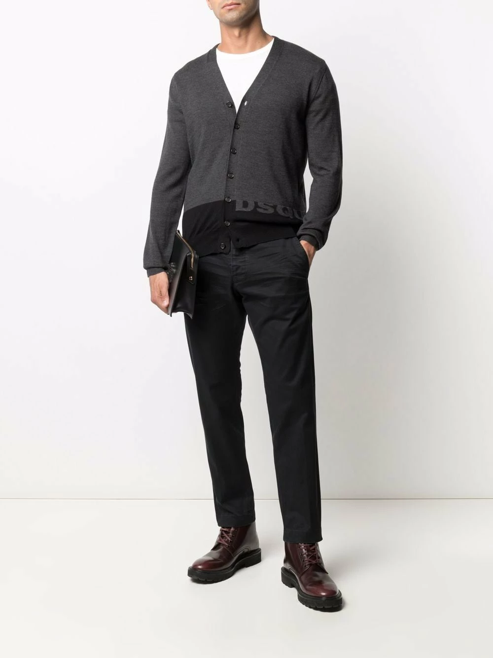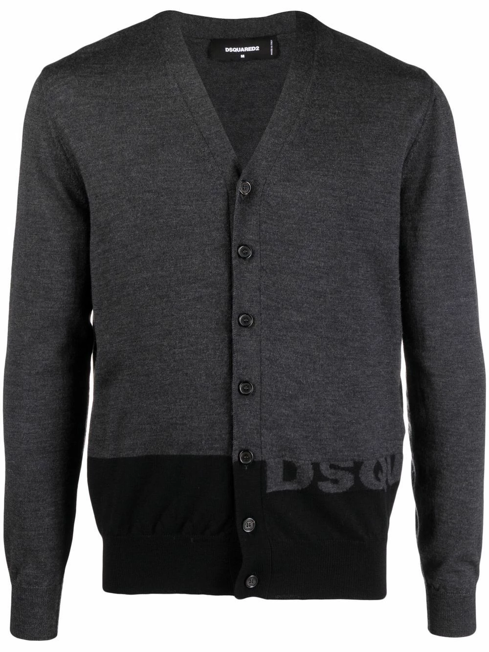 Logo imprimé sur le devant, modèle bicolore, boutonnière sur le devant, col v, manches longues. Matière : laine.