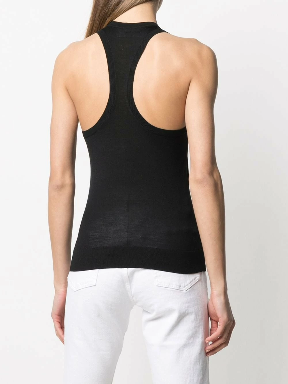 Maille fine, encolure ras du cou, dos nageur, logo intarsia, ourlet nervuré. Matière : laine vierge.