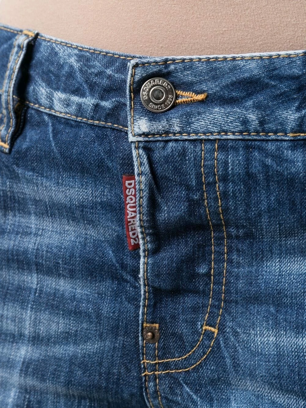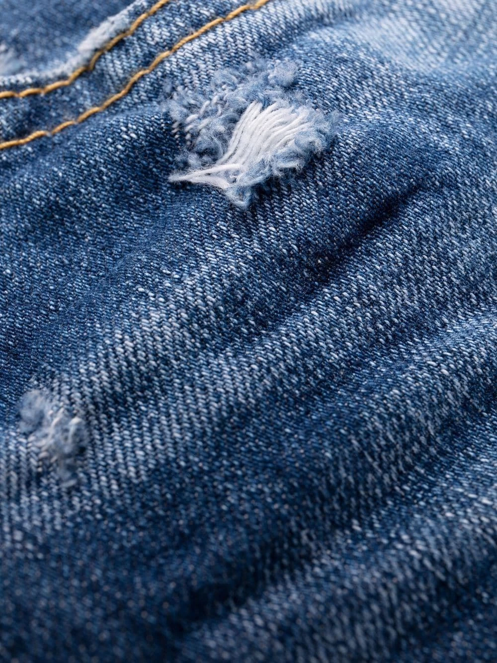 Effet semi-délavé, effet usé, patch logo sur l’arrière, patch logo sur le devant, coupe skinny, longueur crop, fermeture à zip et boutons sur le devant, 5 poches classiques. Couleur : bleu. Matière : coton.
