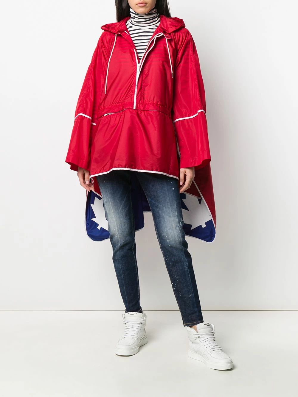 Veste à capuche à logo imprimé Dsquared2 avec lien de resserrage à la taille, fermeture zippée devant, poche zippée devant, manches longues, logo imprimé à l’arrière et coupe midi. Couleur : rouge.