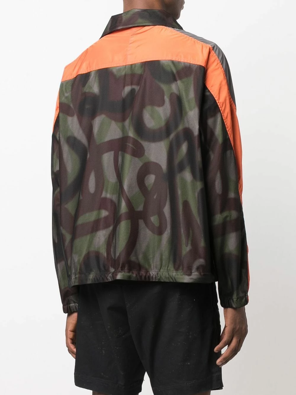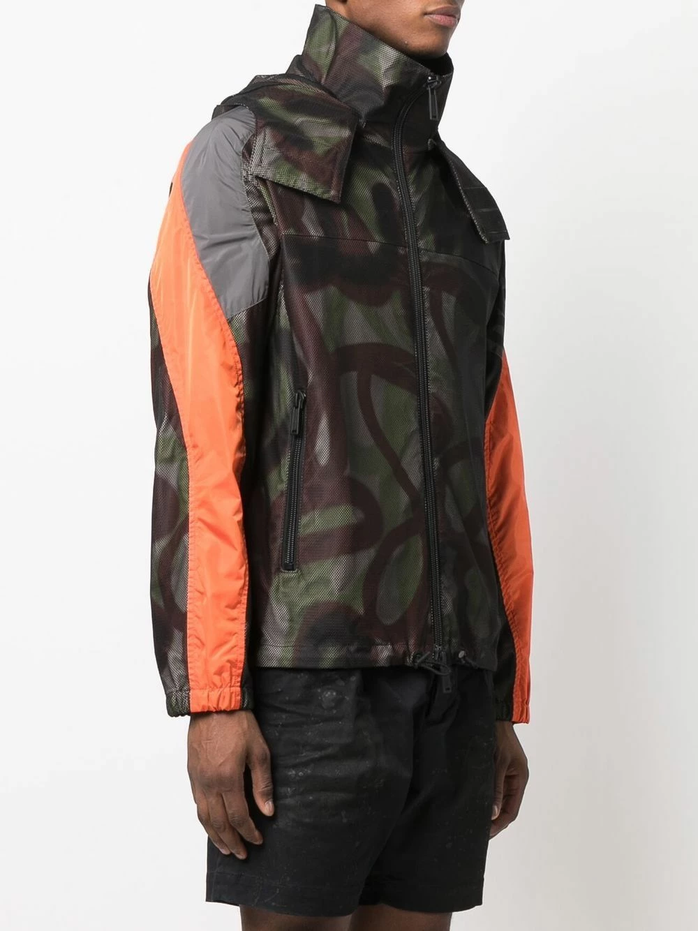 Motif camouflage, col cheminée, fermeture zippée devant, manches longues.