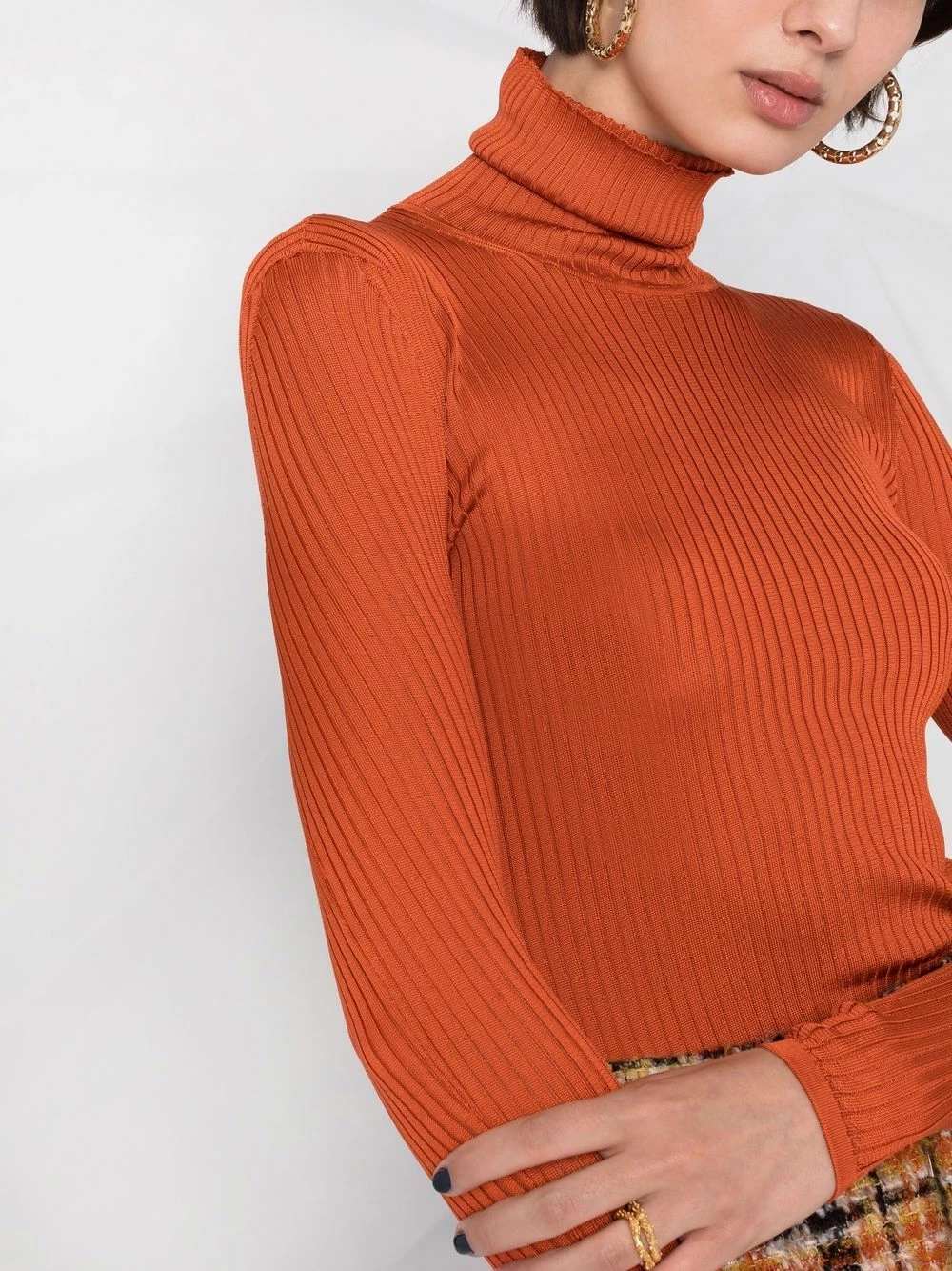 Maille nervurée, col roulé, manches longues, ourlet droit. Couleur : orange. Matière : soie.