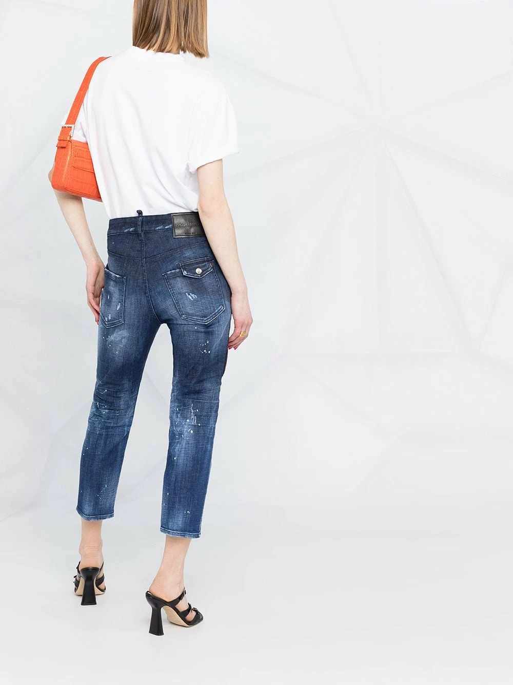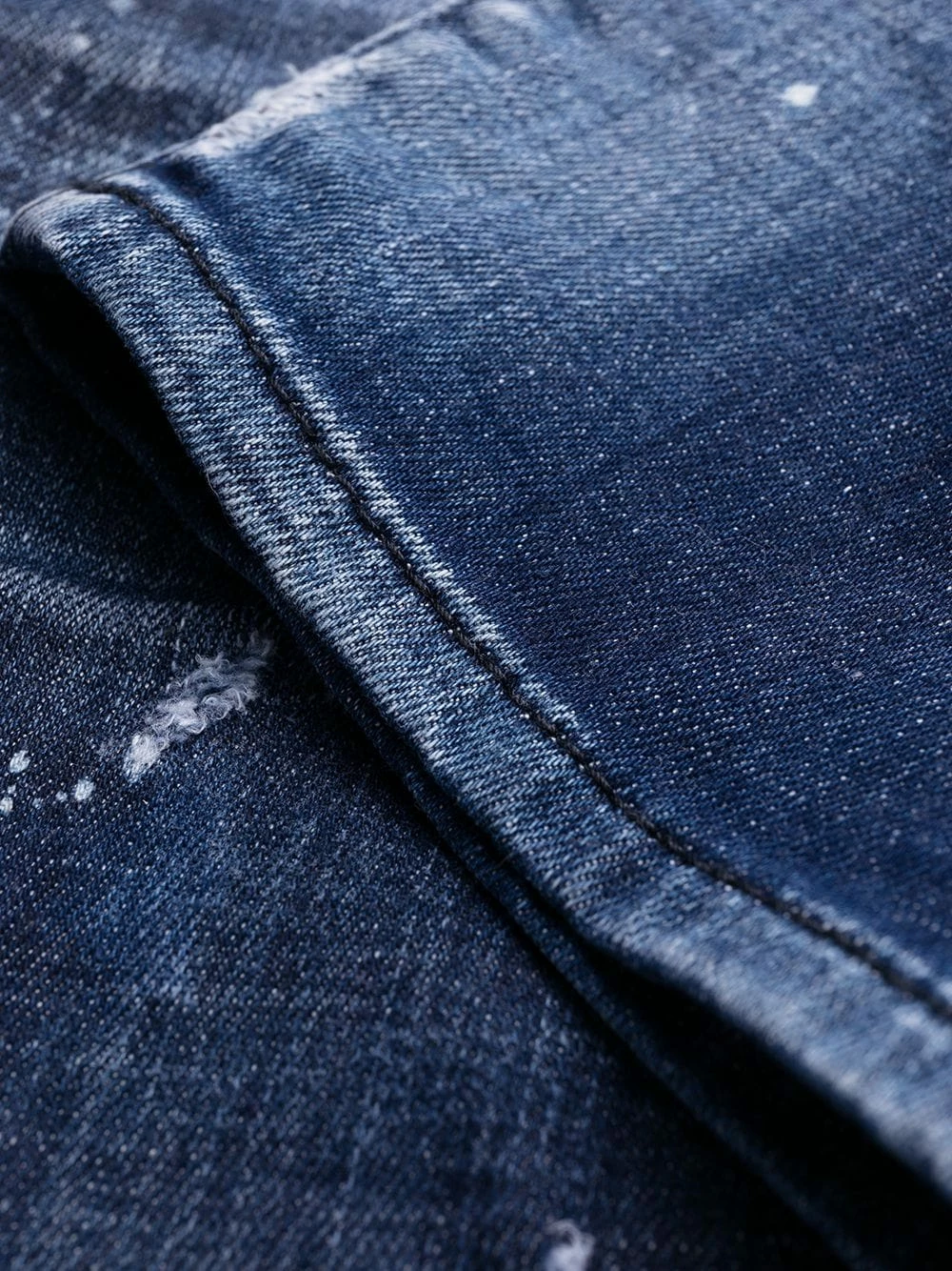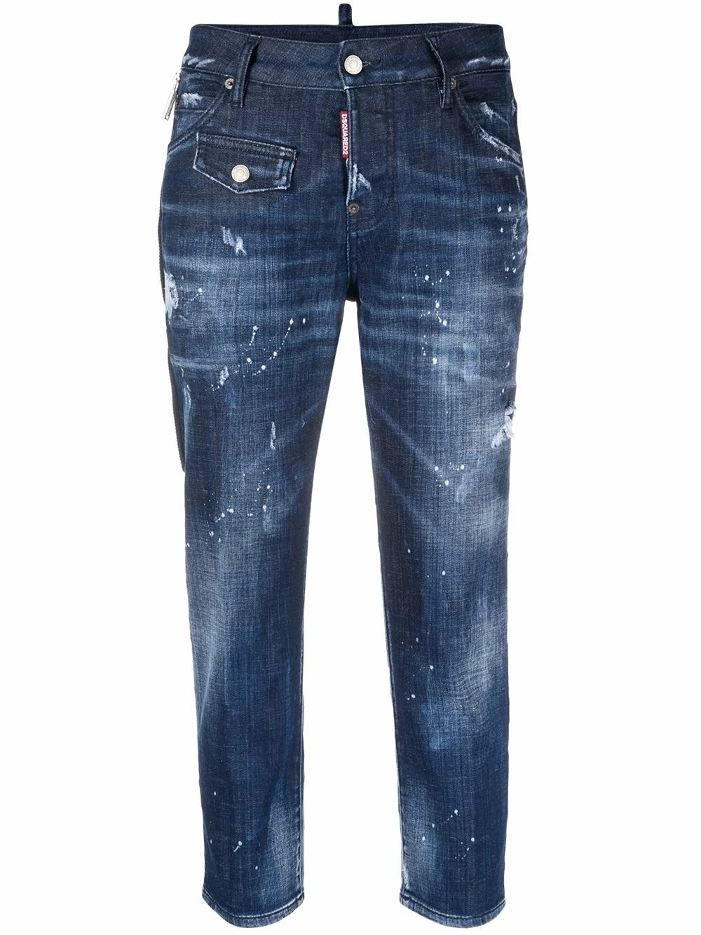 Détail de zip, empiècement en mesh, effet usé, longueur crop, taille mi-haute, passants de ceinture, fermeture dissimulée sur le devant, 5 poches classiques, poche devant à rabat. Couleur : bleu.