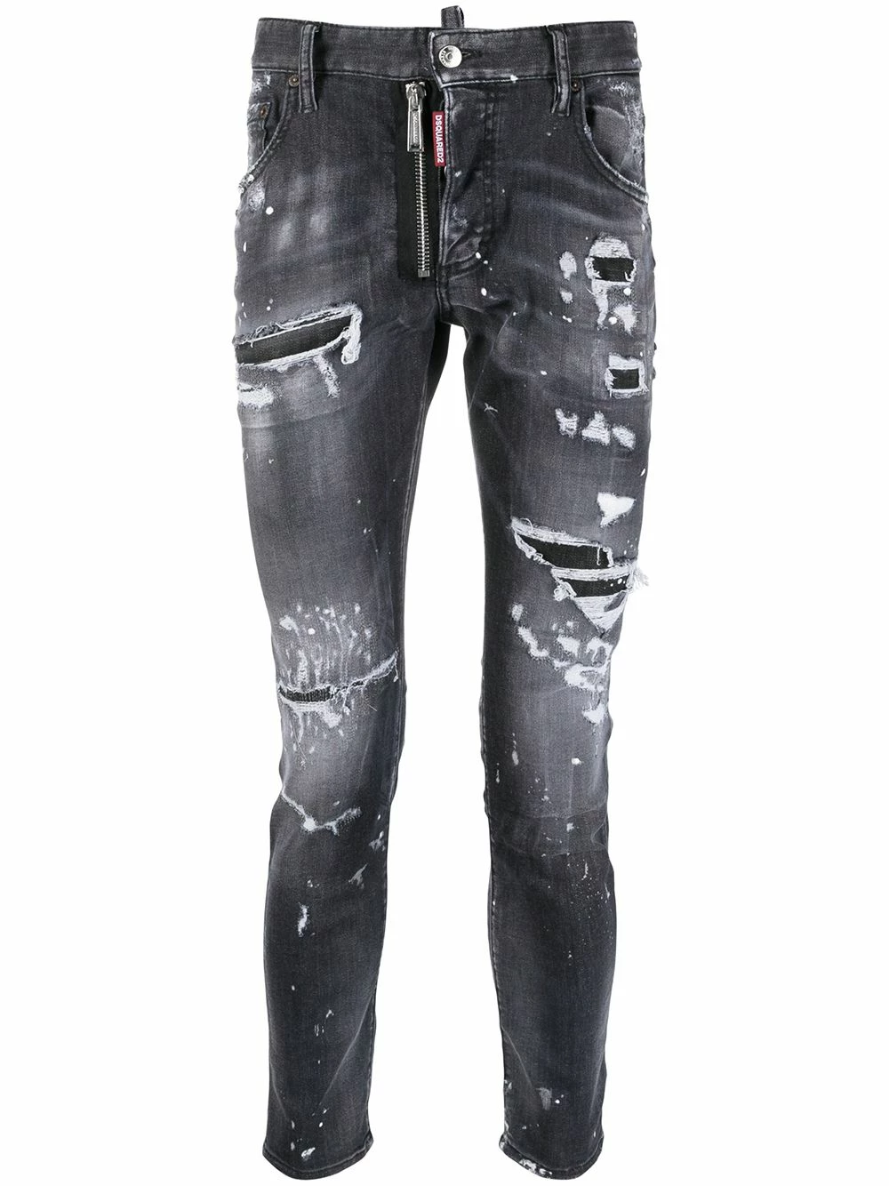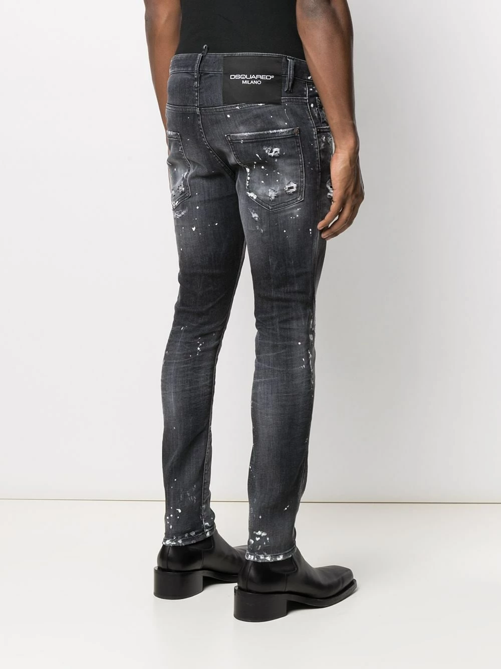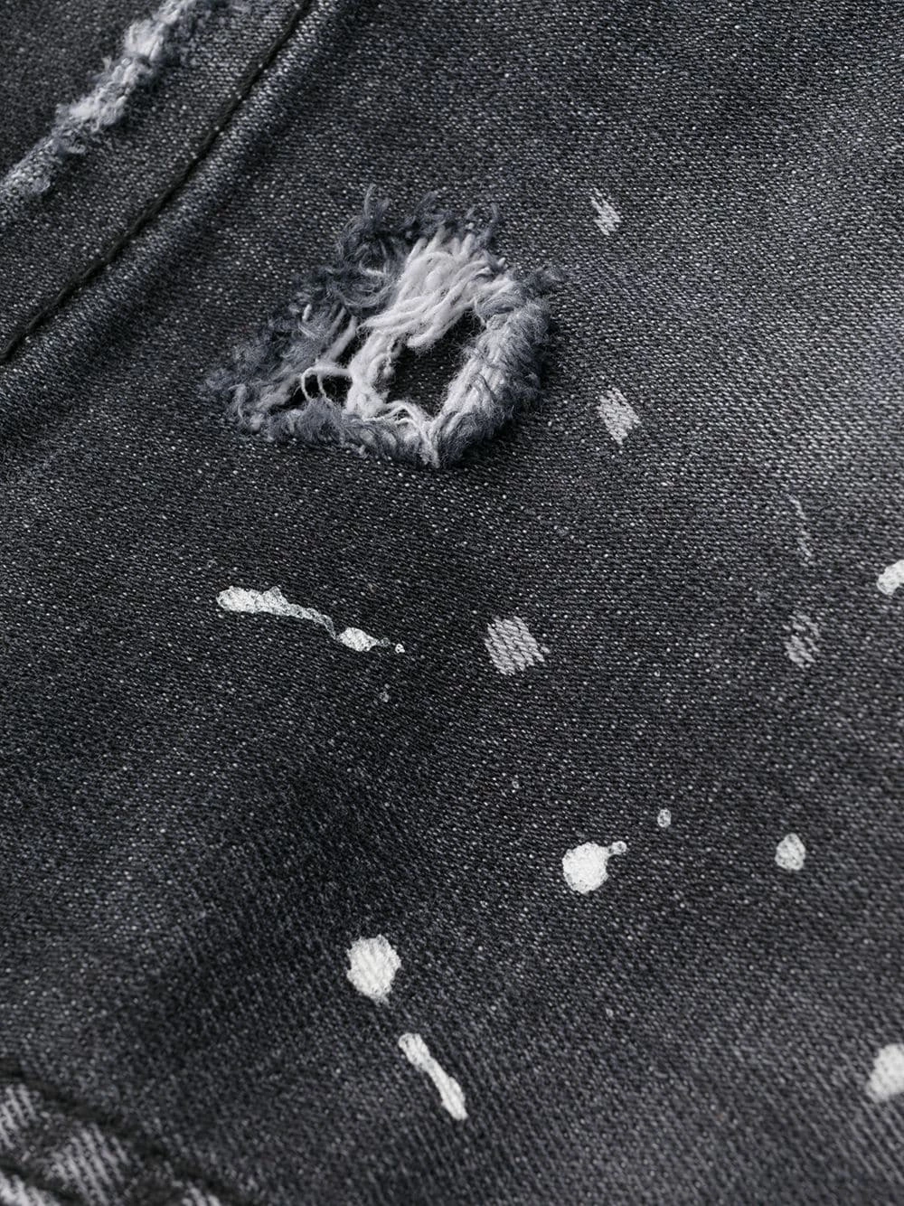 Effet taches de peinture, finitions effilochées, patch logo sur l’arrière, passants de ceinture, taille basse, boutonnière sur le devant, coupe skinny, 5 poches classiques. Couleur : Noir.
