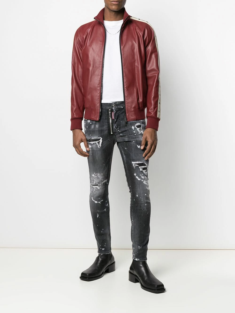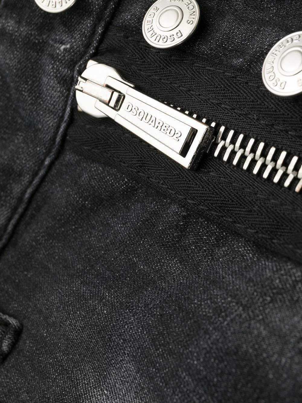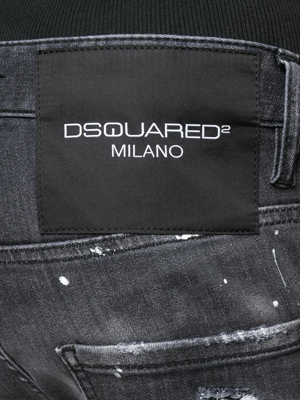 Effet taches de peinture, finitions effilochées, patch logo sur l’arrière, passants de ceinture, taille basse, boutonnière sur le devant, coupe skinny, 5 poches classiques. Couleur : Noir.