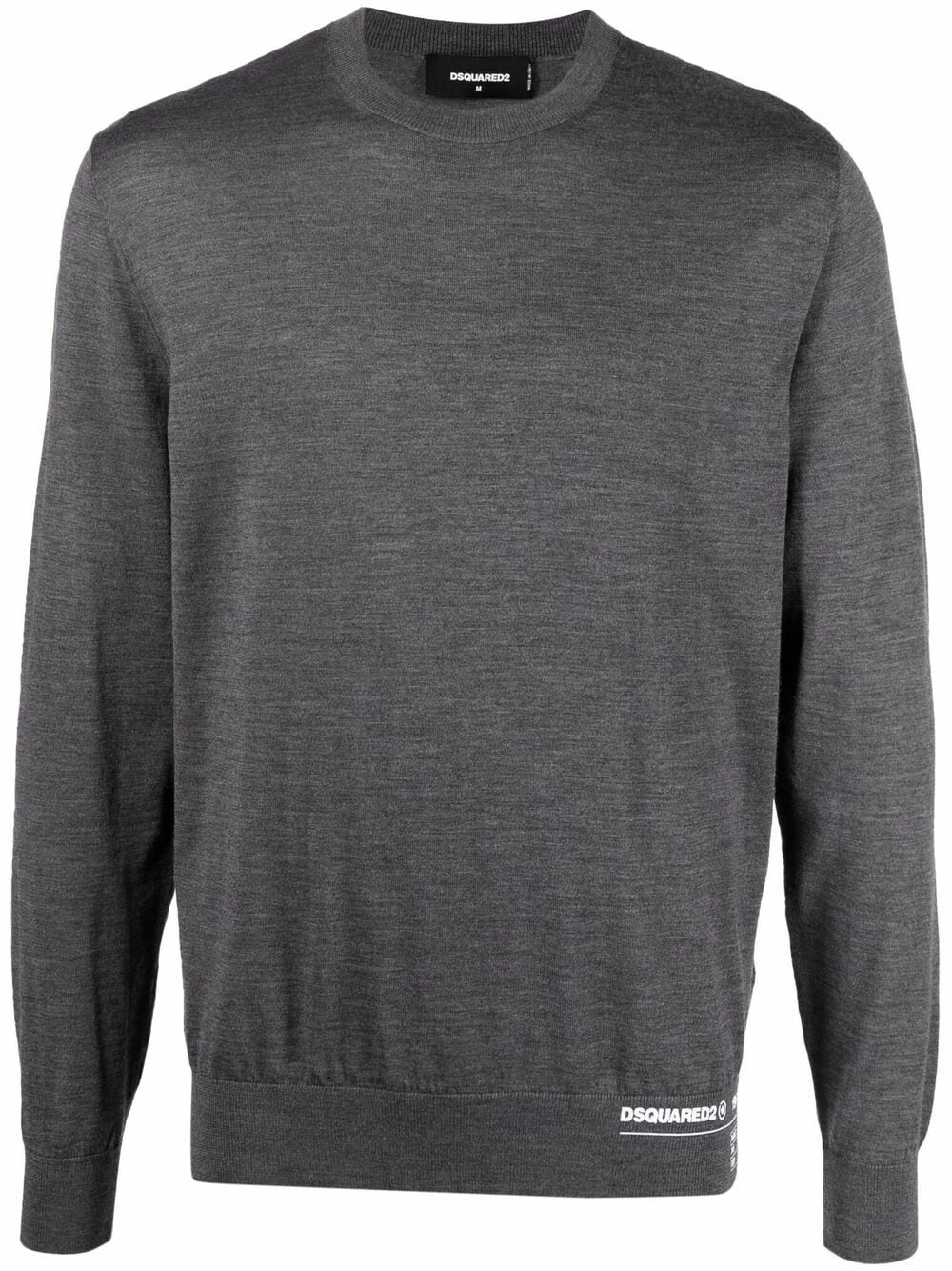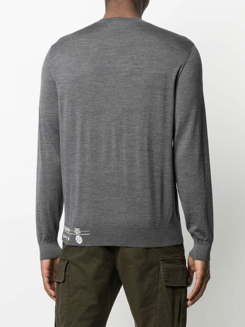 Logo imprimé sur le côté, encolure ras du cou, manches longues, ourlet droit, bordures nervurées. Couleur : gris. Matière : laine.