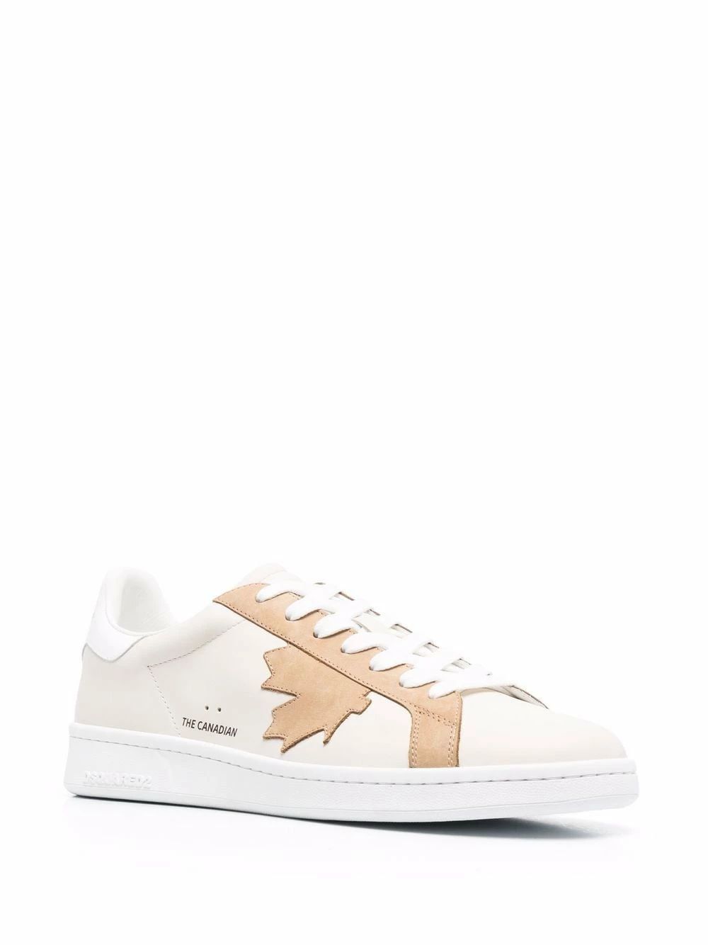 Imprimé feuille d’érable, slogan imprimé sur le côté, languette à logo imprimé, bout rond, fermeture à lacer sur le devant, contrefort contrastant, contrefort à logo, semelle plate en caoutchouc. Matière : cuir de veau.