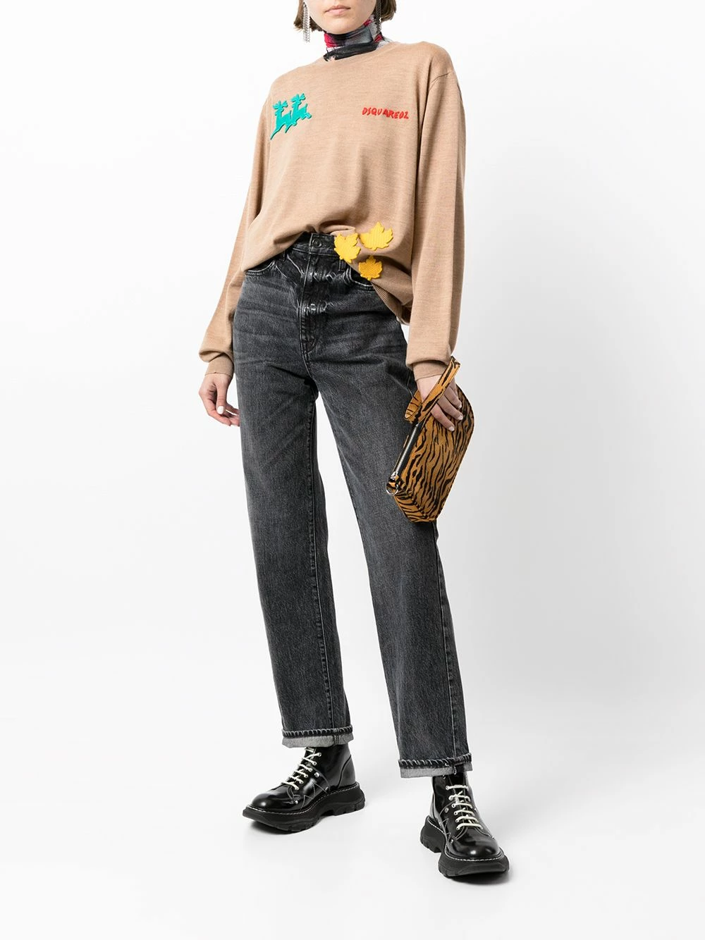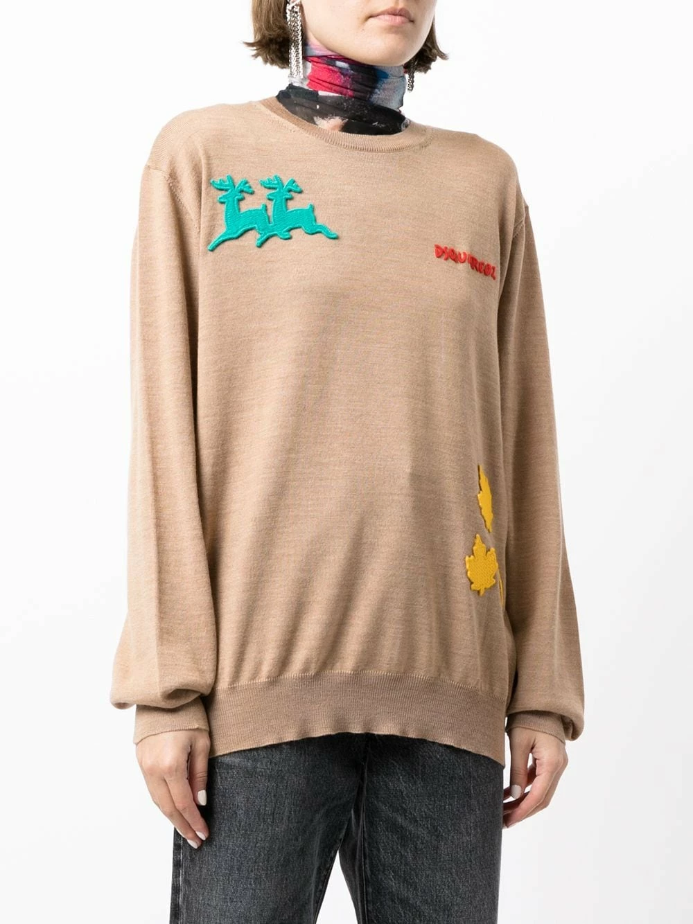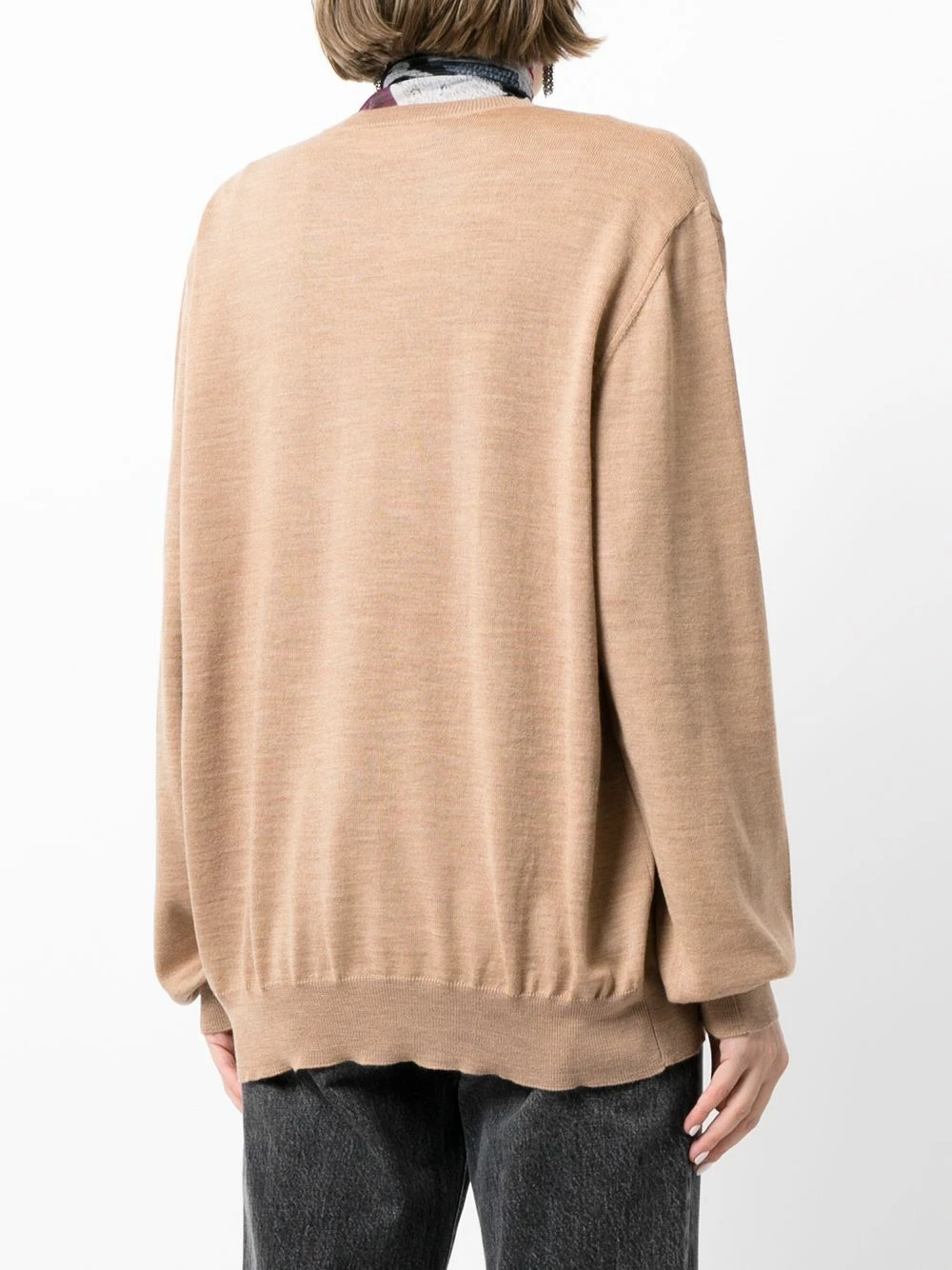 Maille fine, finitions nervurées, détail de patch, manches longues, encolure ras du cou, ourlet droit.