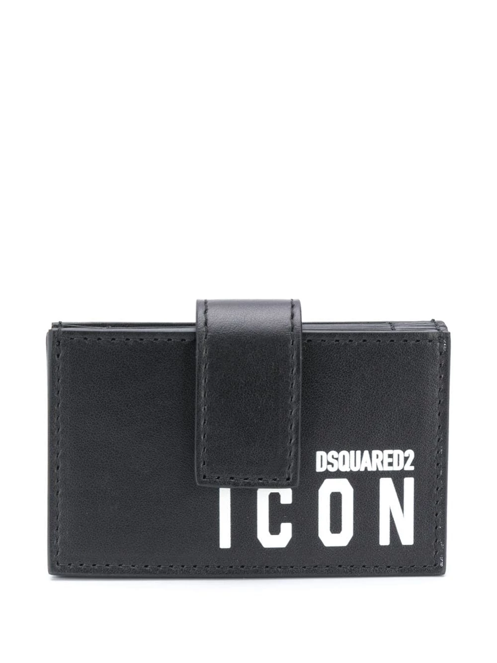 Logo imprimé sur le devant, fermeture à boutons pression, plissé accordéon, compartiments intérieurs pour carte. Couleur : noir. Matière : Cuir de veau.