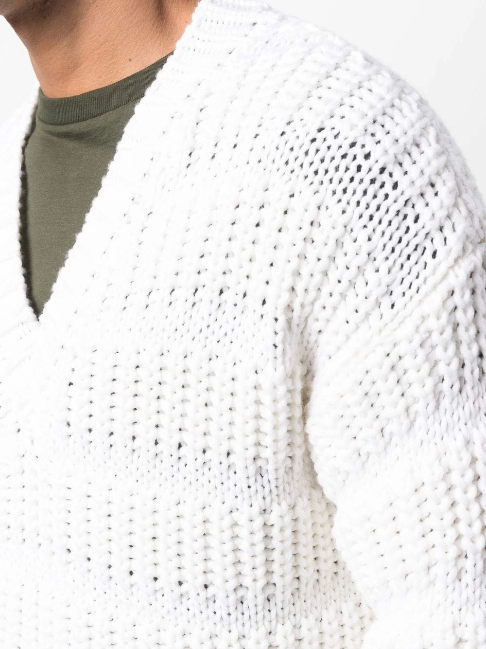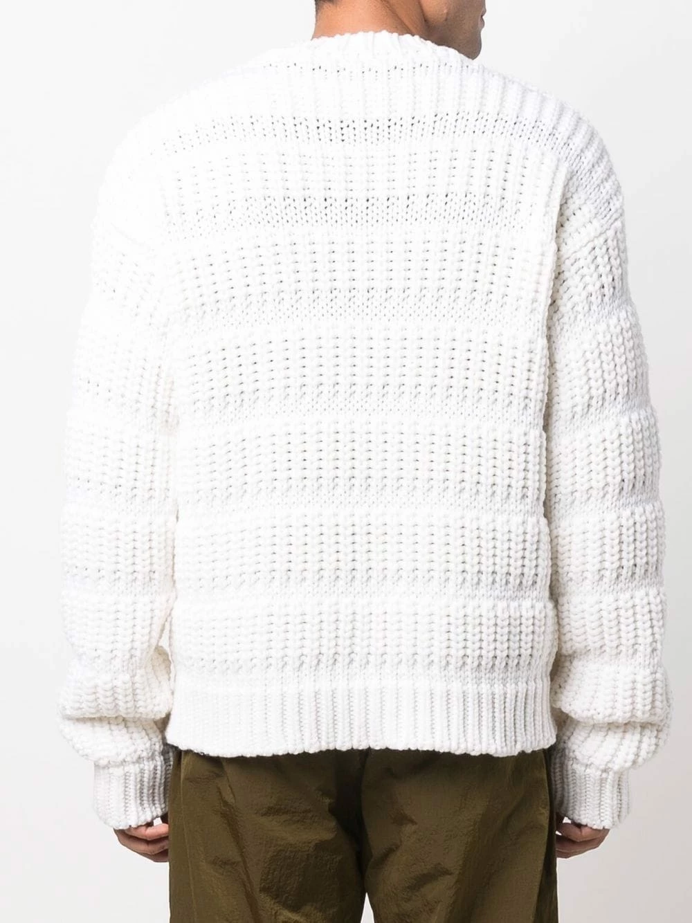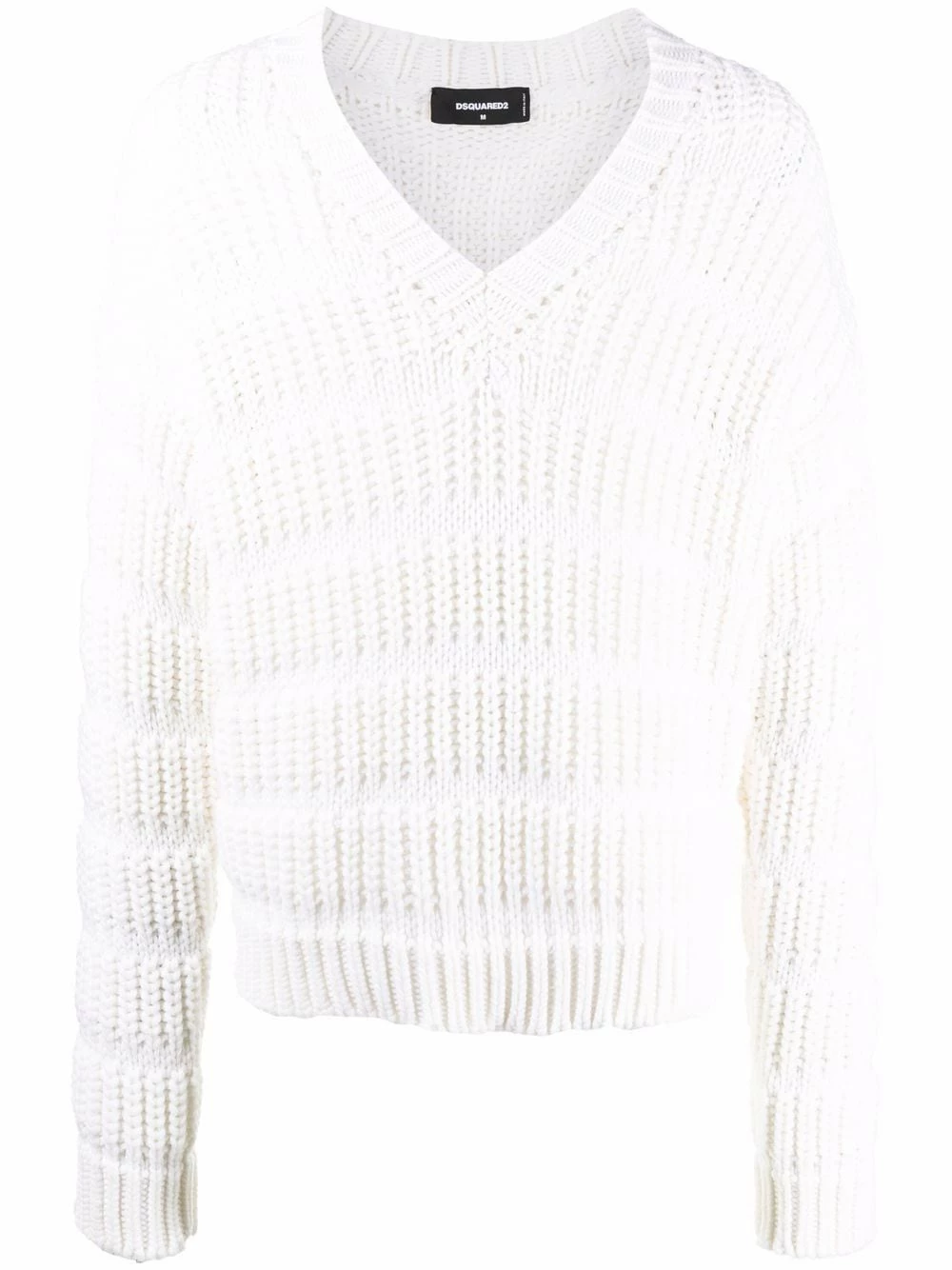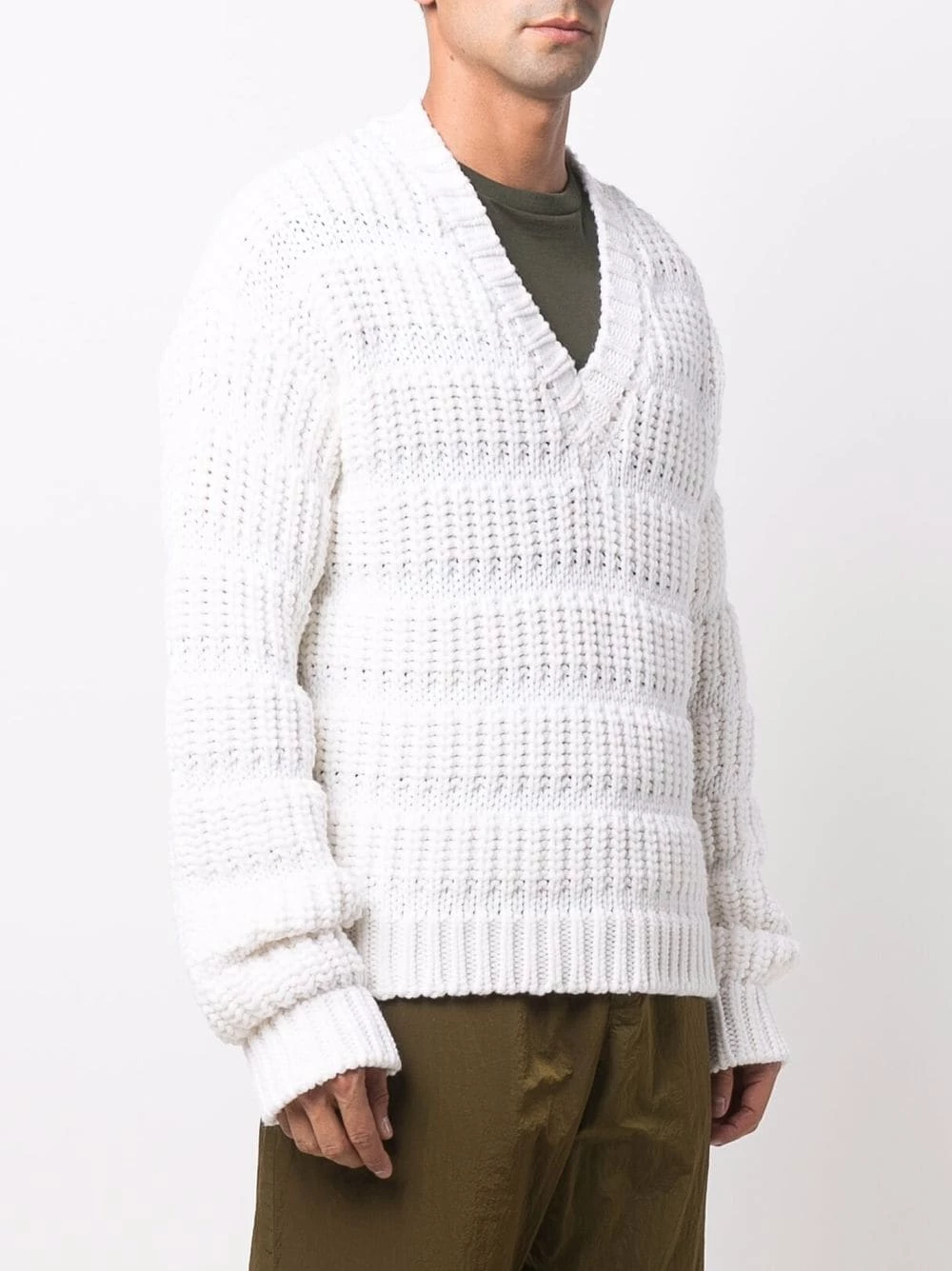 Rayures horizontales, détail nervuré, col v profond, manches longues, ourlet droit. Couleur : blanc. Matière : laine.