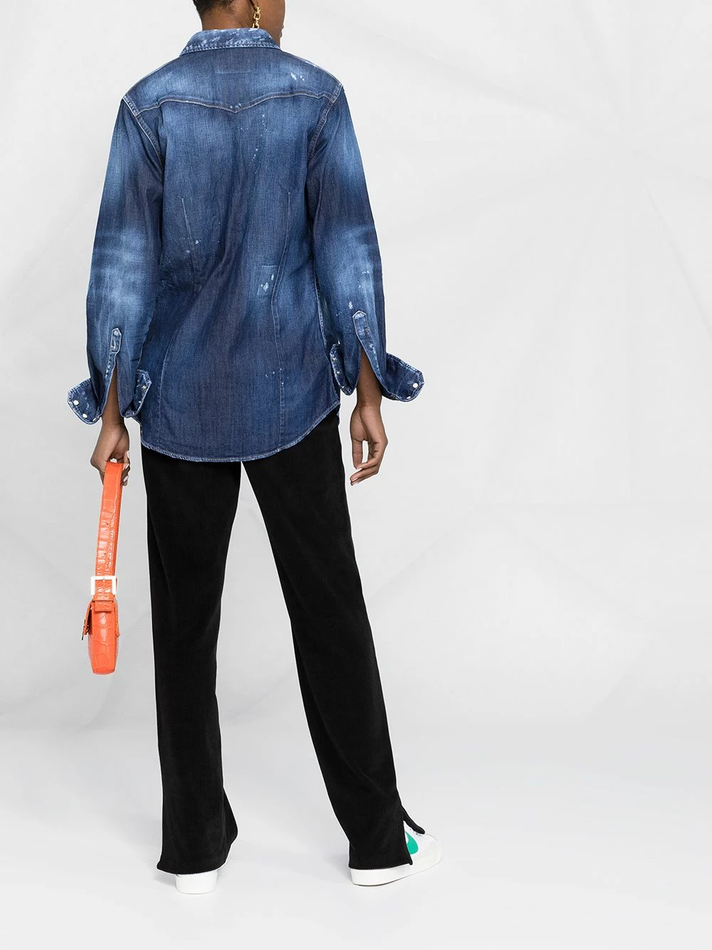 Effet délavé, effet usé, col classique, boutonnière sur le devant, deux poches poitrine plaquées, manches longues, poignets boutonnés, ourlet incurvé. Couleur : Bleu.