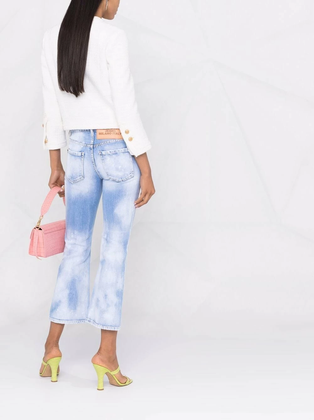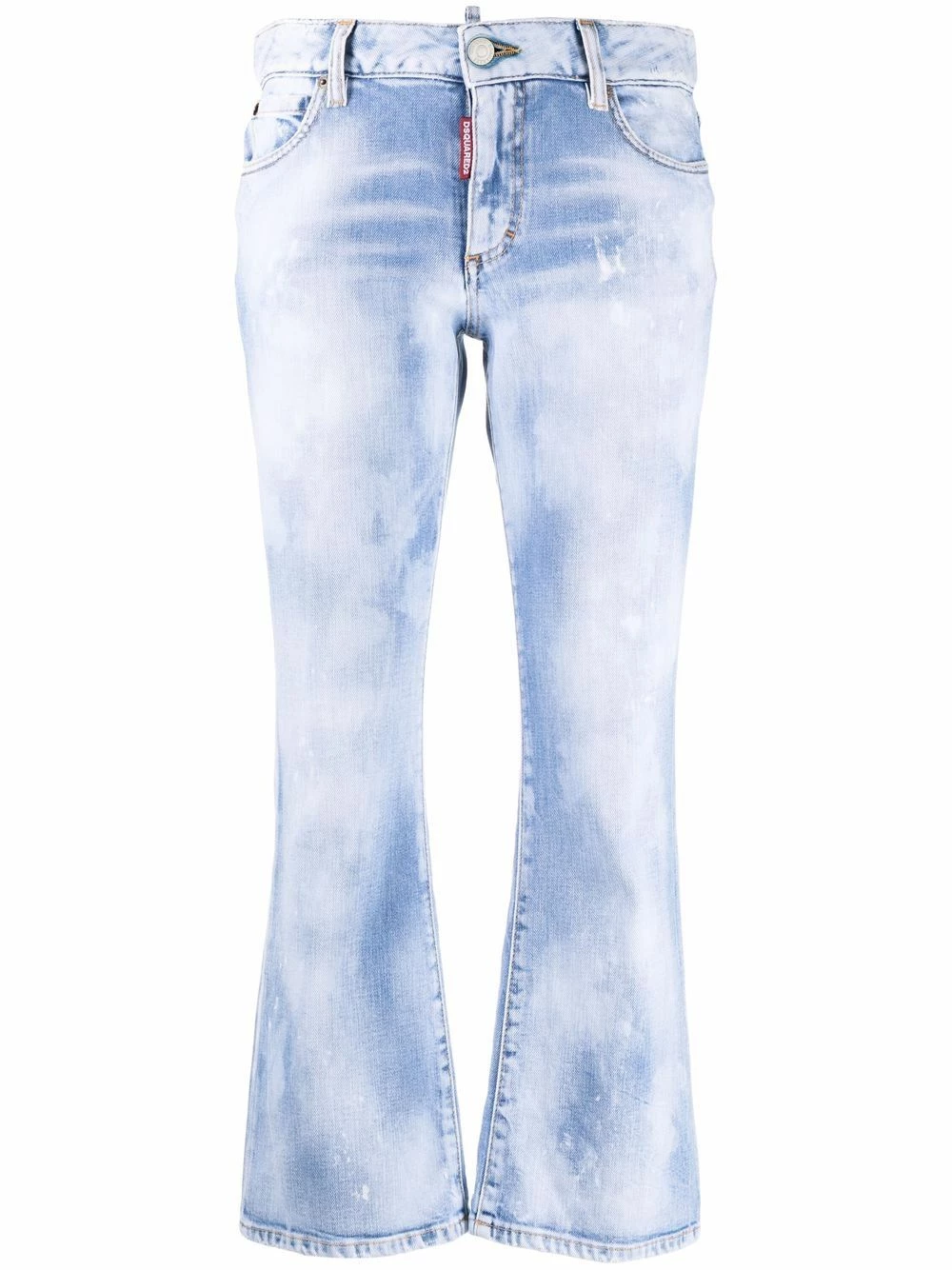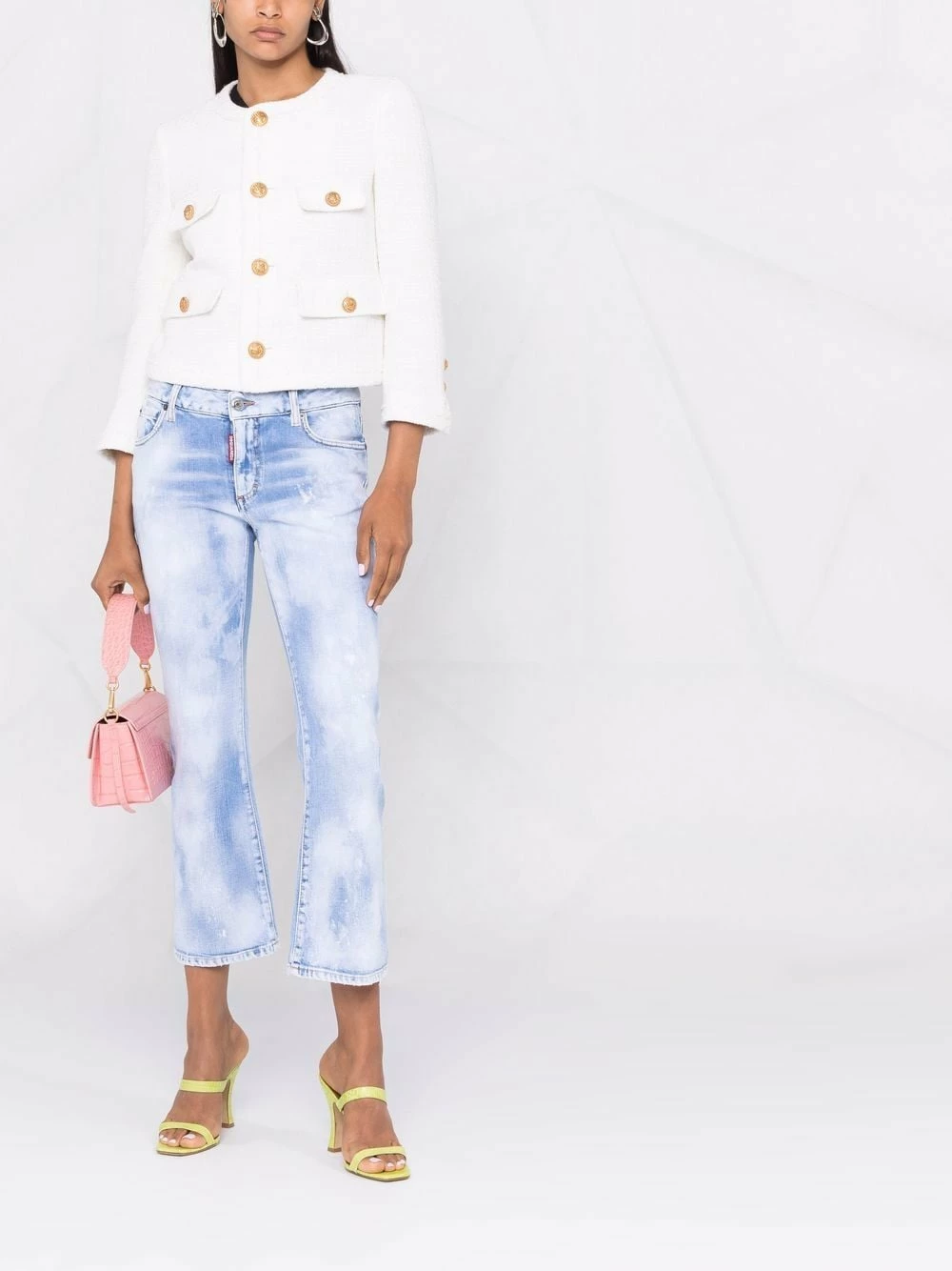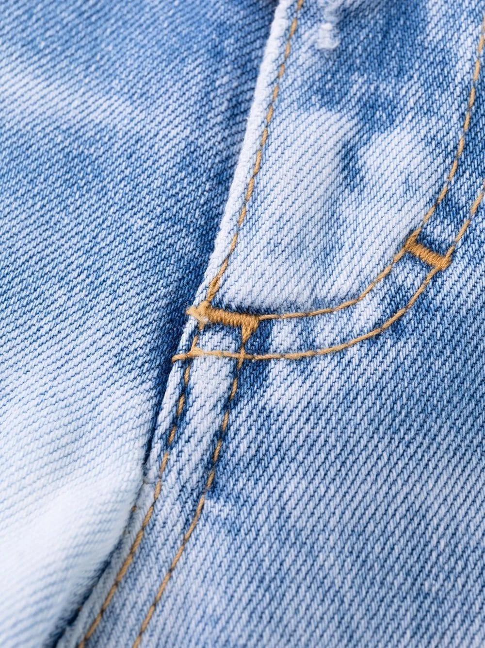 Taille basse, passants de ceinture, coutures contrastantes, finitions à effet usé sur les cuisses, cinq poches classiques, patch logo sur l’arrière, effet délavé, coupe évasée, longueur crop. Couleur : bleu.