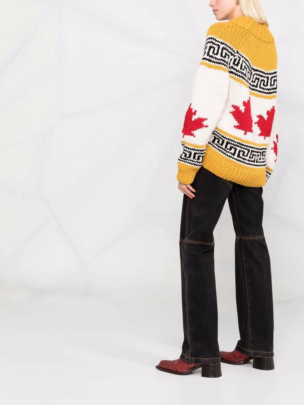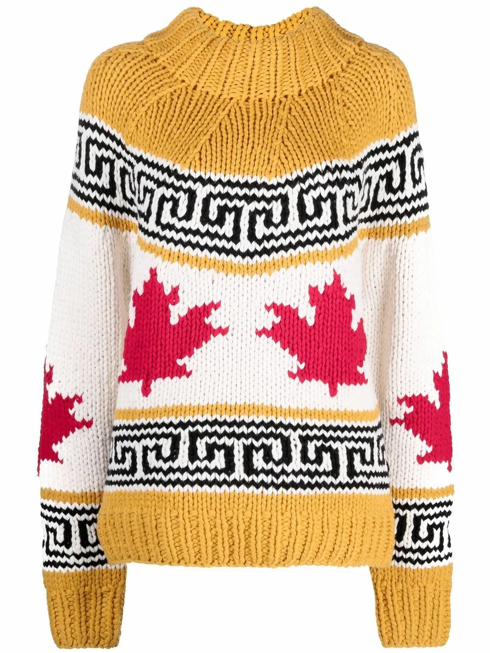 Maille intarsia, imprimé feuille d’érable, bordures nervurées, col montant, manches longues.