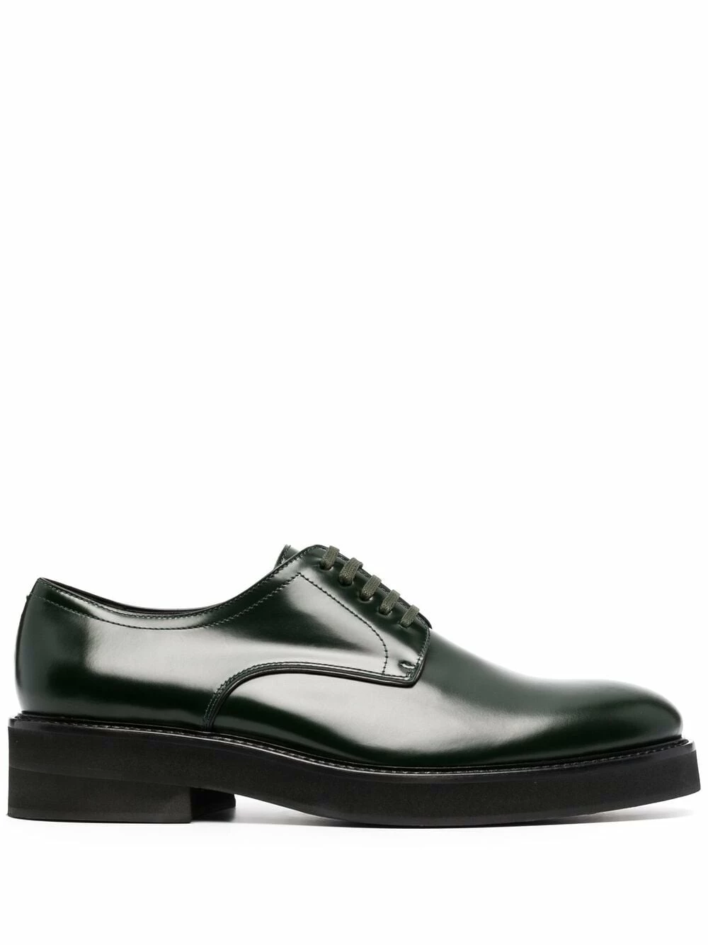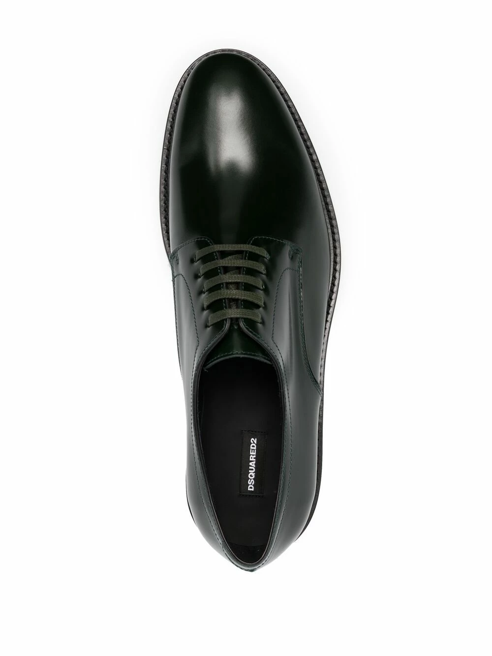Bout rond, fermeture à lacer sur le devant, petit talon épais. Matière : cuir de veau.