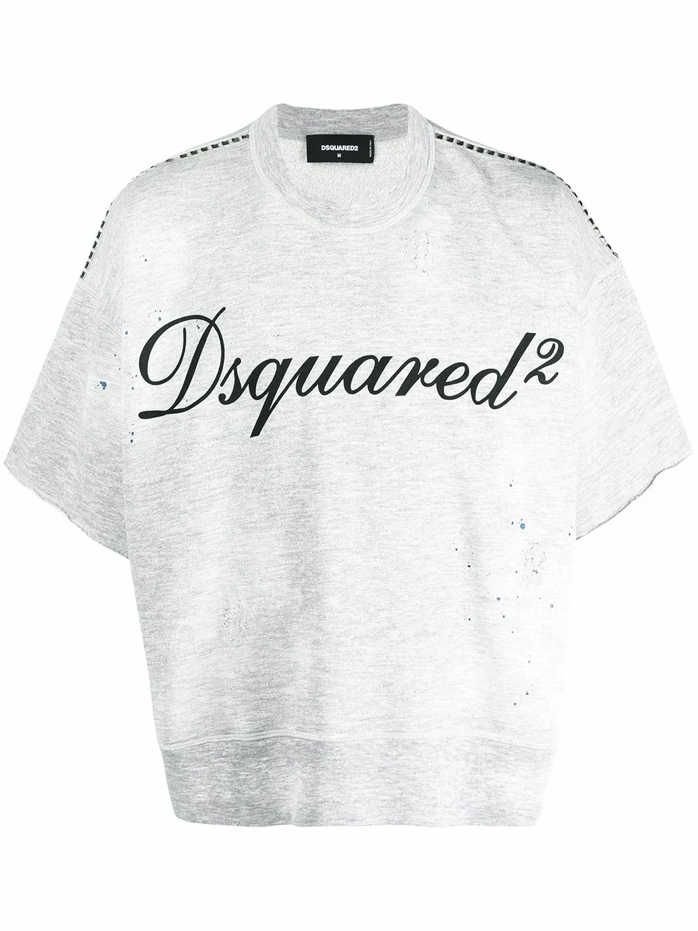 Détails de clous argentés, logo imprimé à la poitrine, encolure ras du cou, manches courtes. Couleur : Gris. Matière : coton.