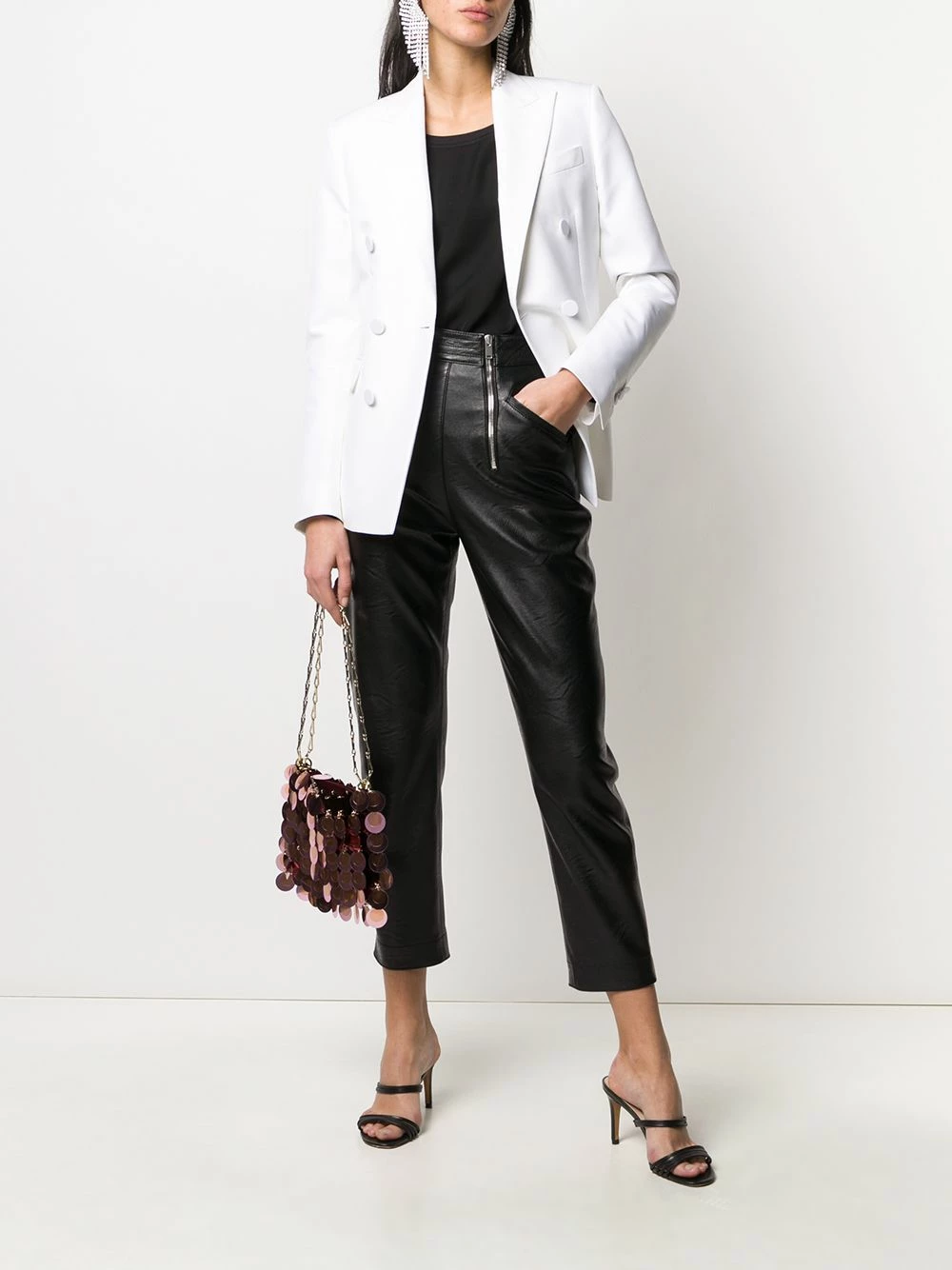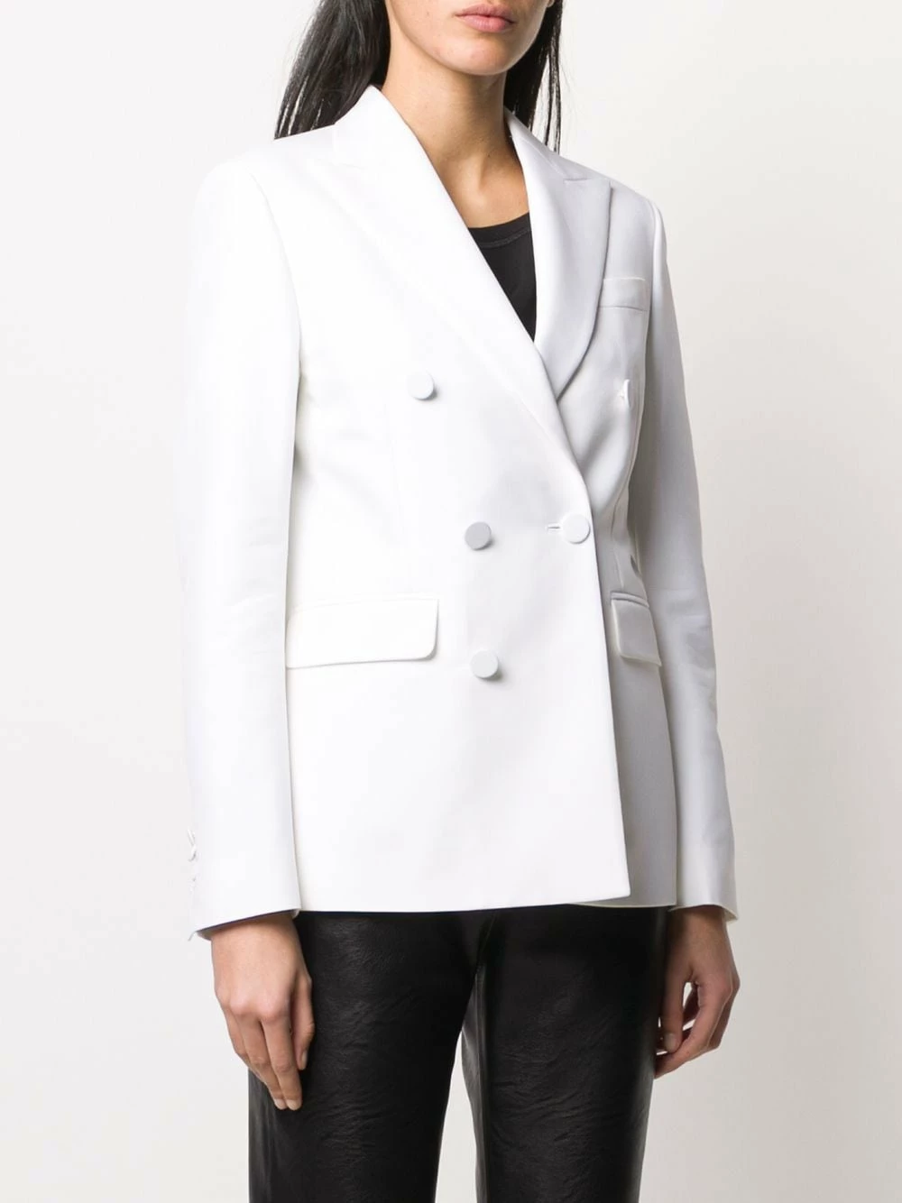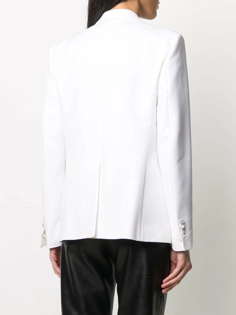 Revers pointus, manches longues, poignets boutonnés, détail de fente. Couleur : blanc.