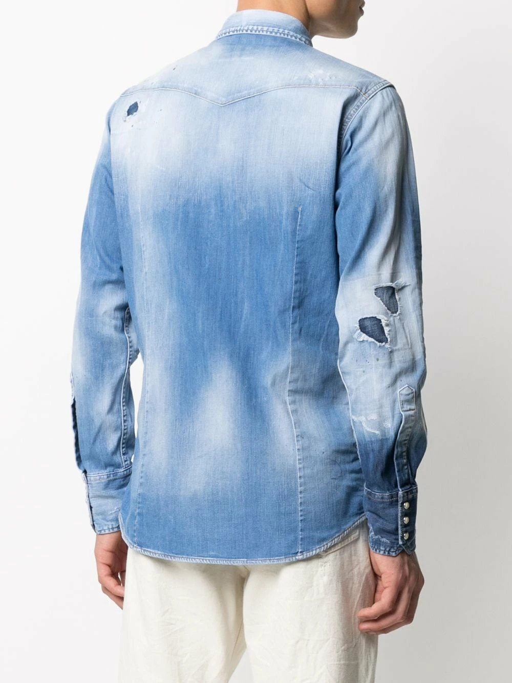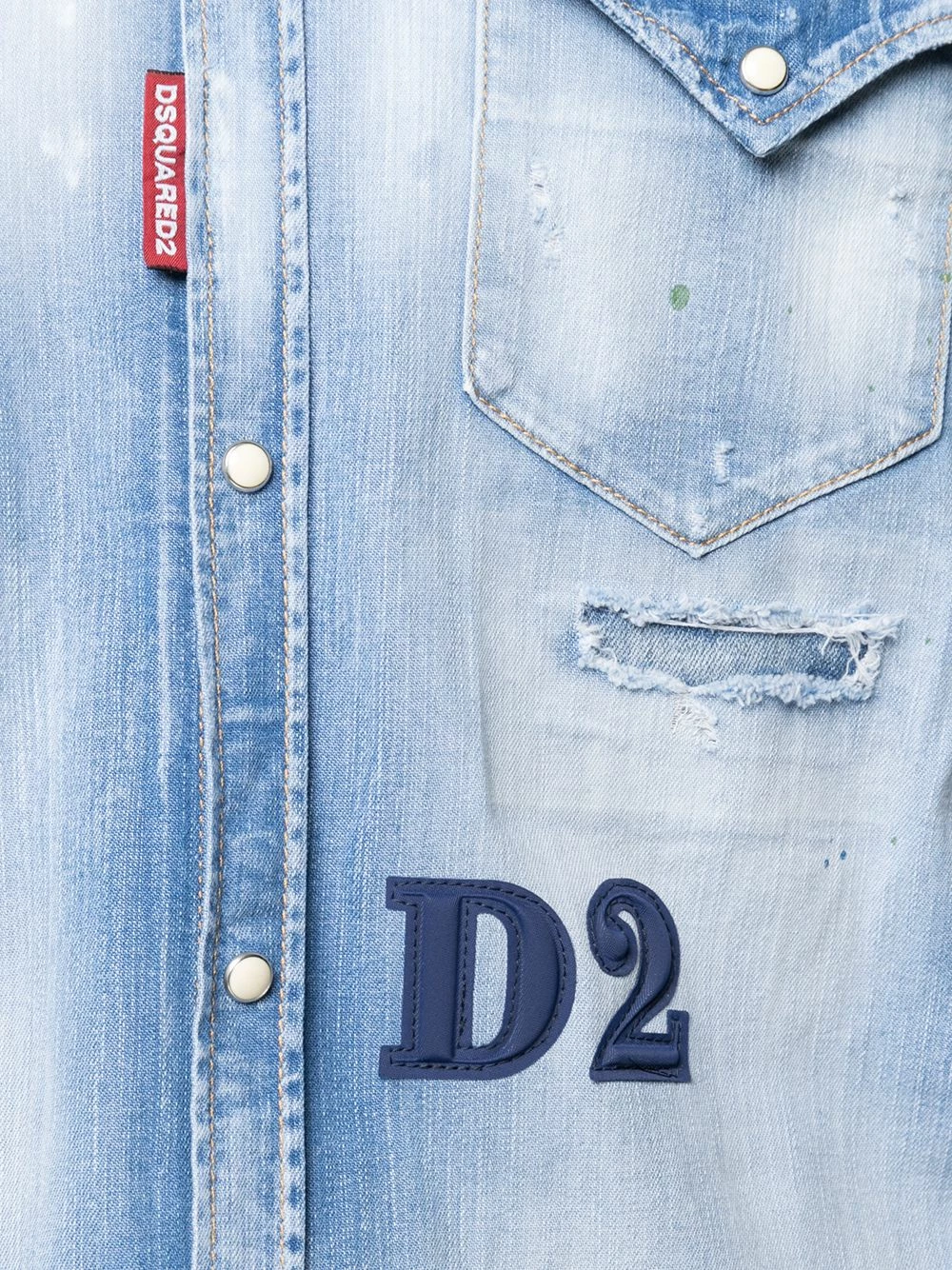 Effet délavé, finitions à effet usé, détail appliqué, col pointu, fermeture à bouton pression, deux poches poitrine à rabat, poignets à boutons pression.