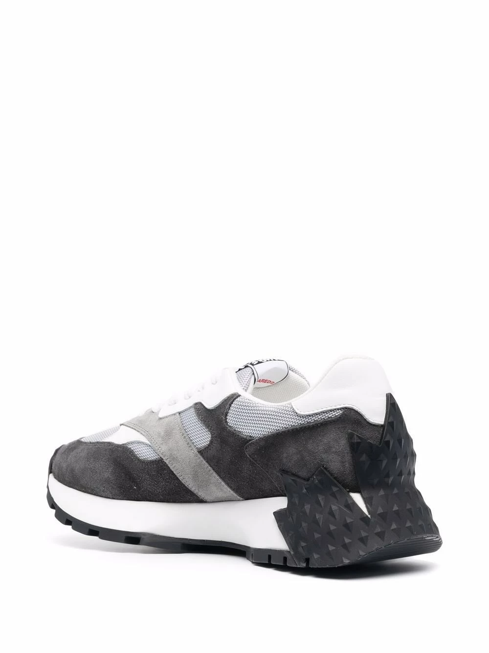 Design à empiècements colour block, design à empiècements, finitions en daim, imprimé feuille d’érable, logo imprimé sur le côté, bout en amande, fermeture à lacer sur le devant, semelle intérieure griffée, semelle en caoutchouc.