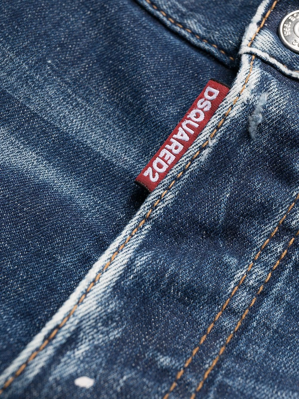 Finitions effilochées, effet taches de peinture, taille mi-haute, passants de ceinture, 5 poches classiques, coupe droite. Couleur : bleu.