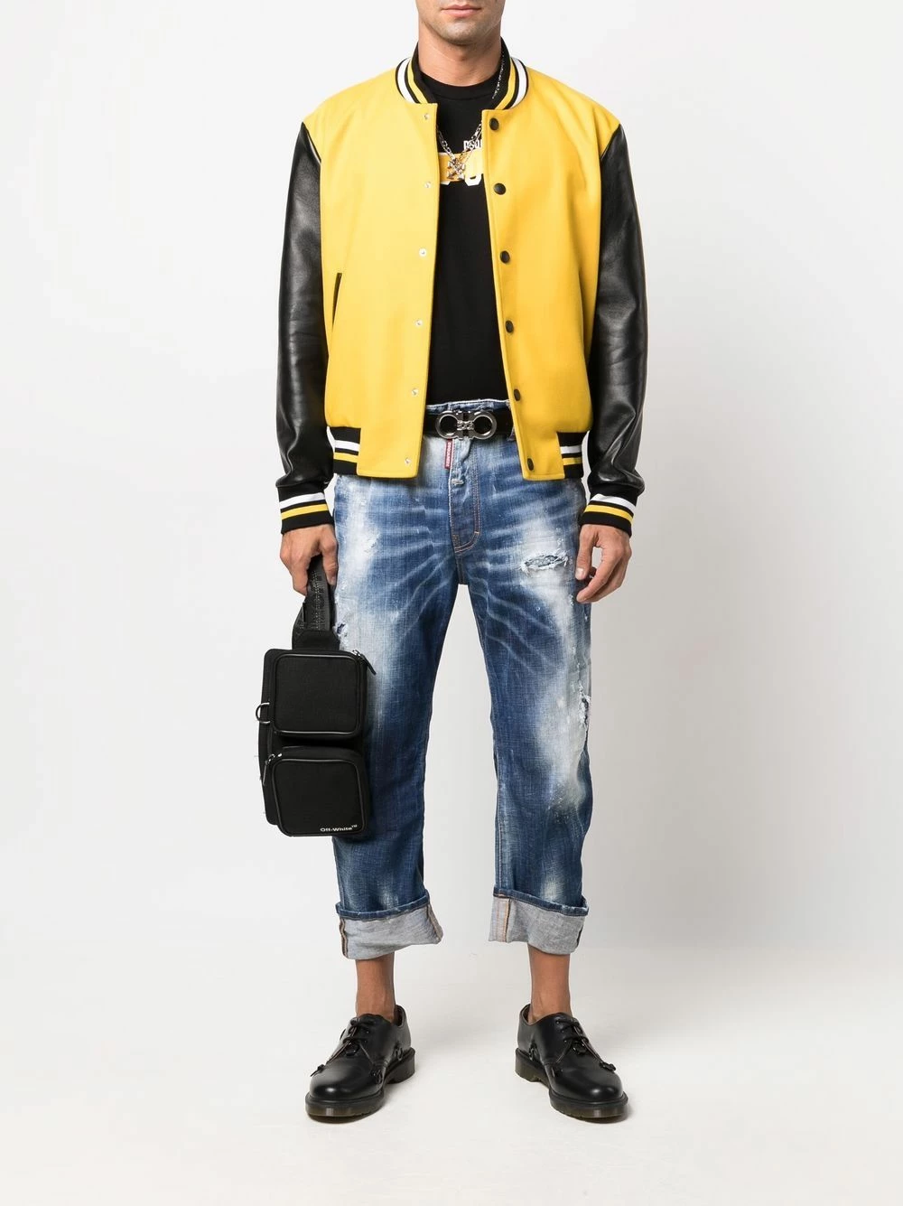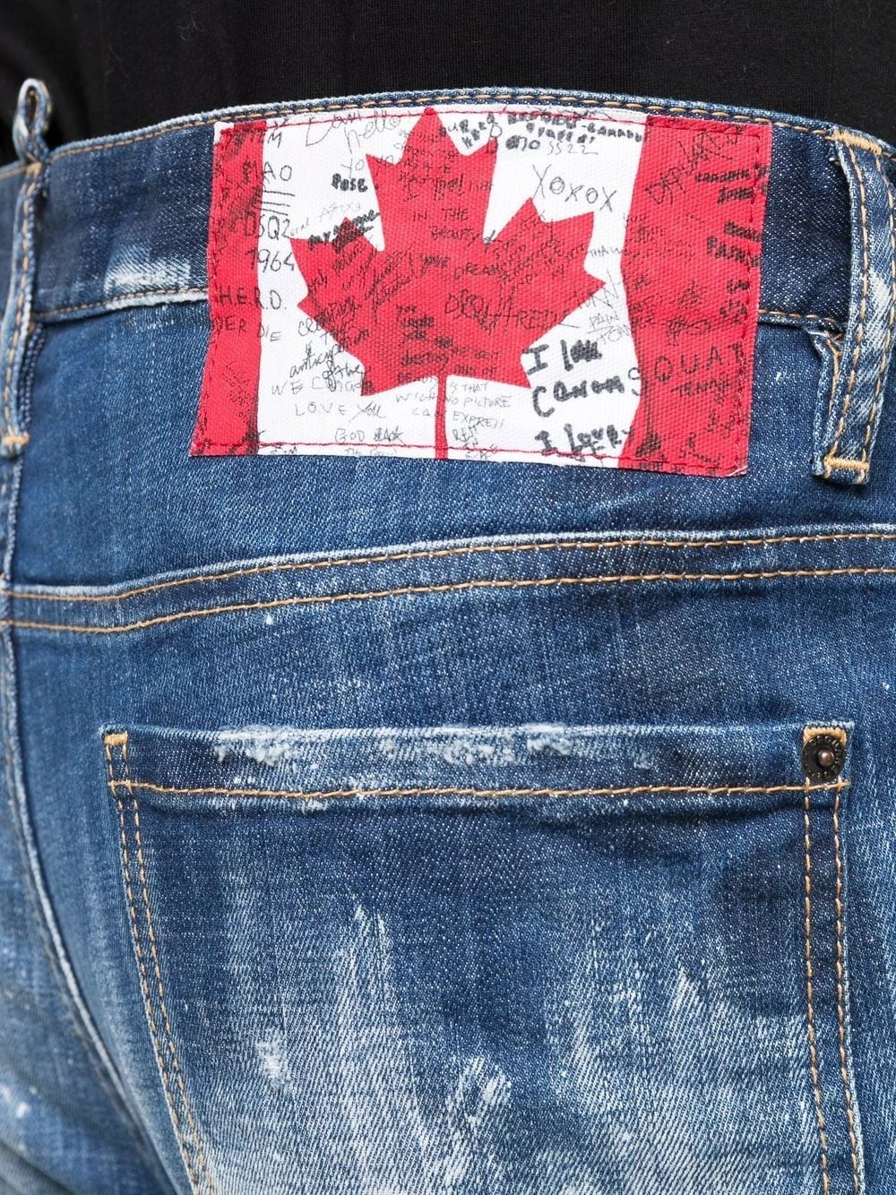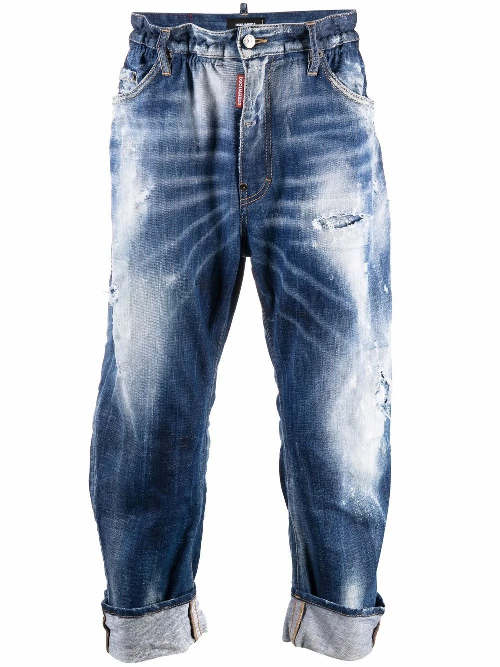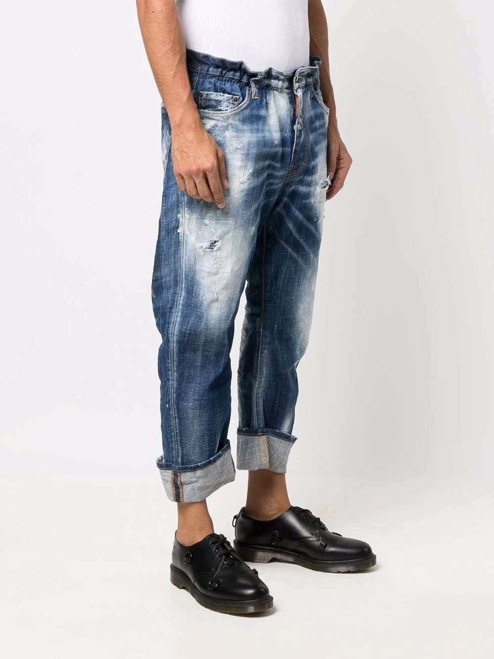Effet usé, finitions effilochées, patch logo sur l’arrière, passants de ceinture, fermeture à braguette dissimulée et bouton, cinq poches classiques, ourlet retroussé, longueur crop. Couleur : bleu.