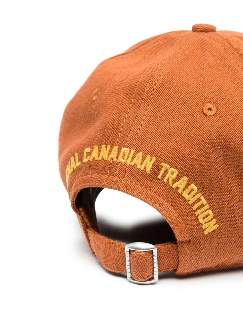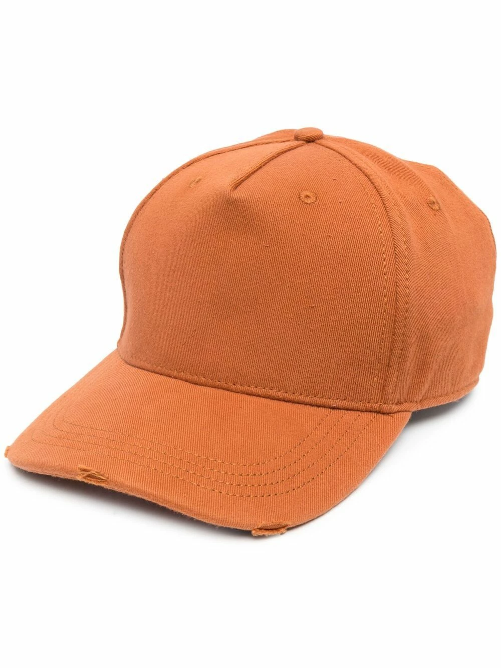 Effet usé, bord incurvé, slogan brodé, bretelle ajustable au dos, taille ajustable. Couleur : orange. Matière : coton.