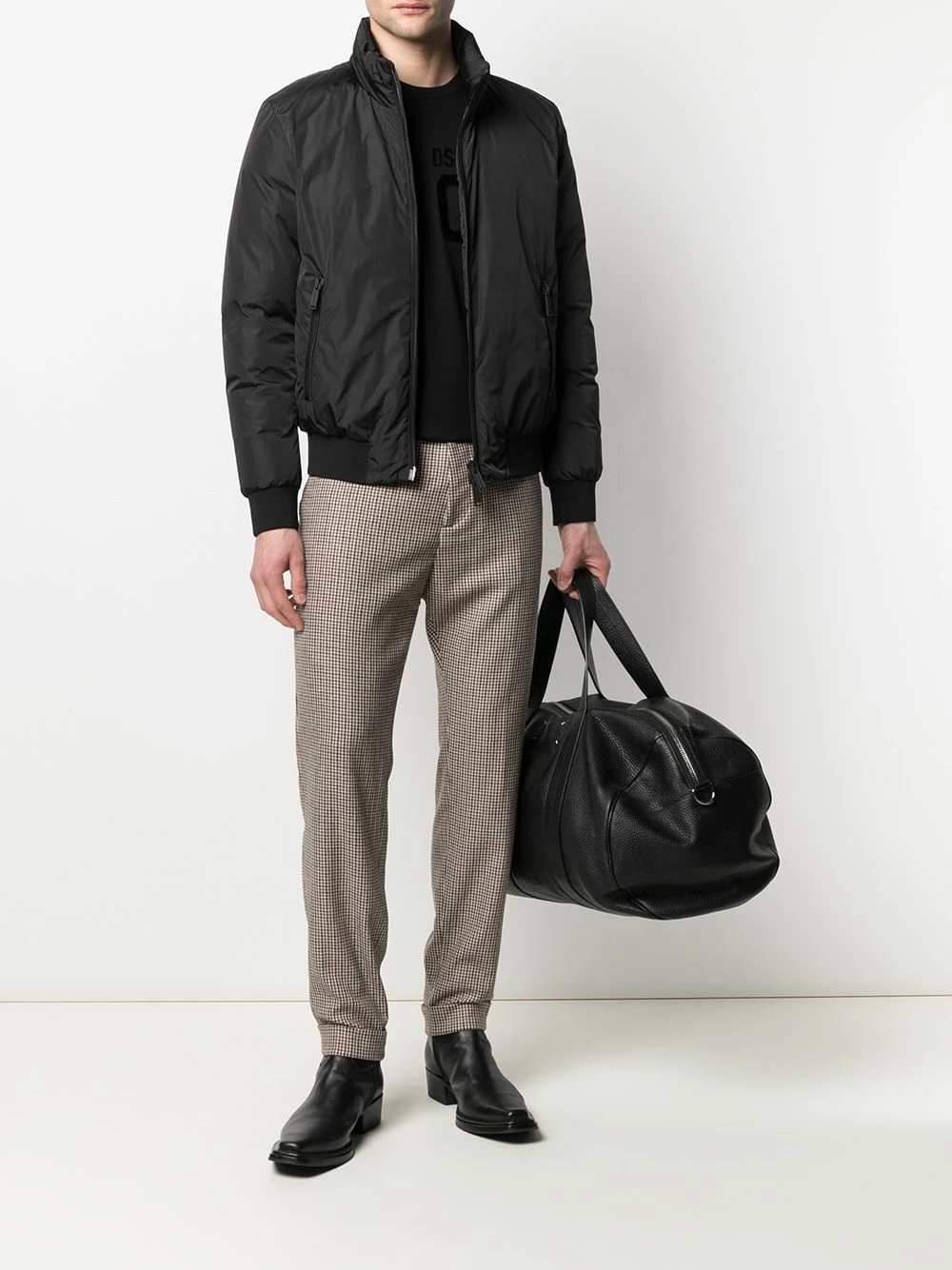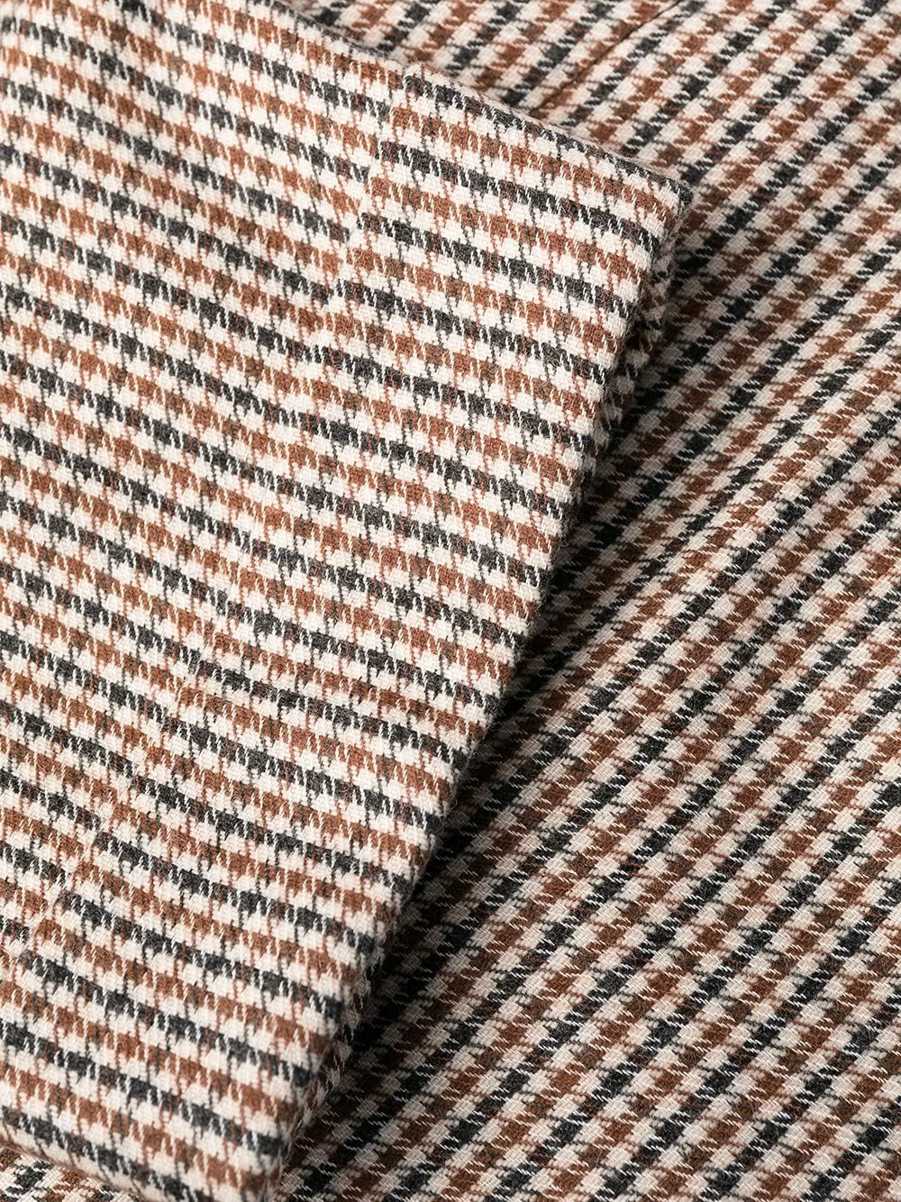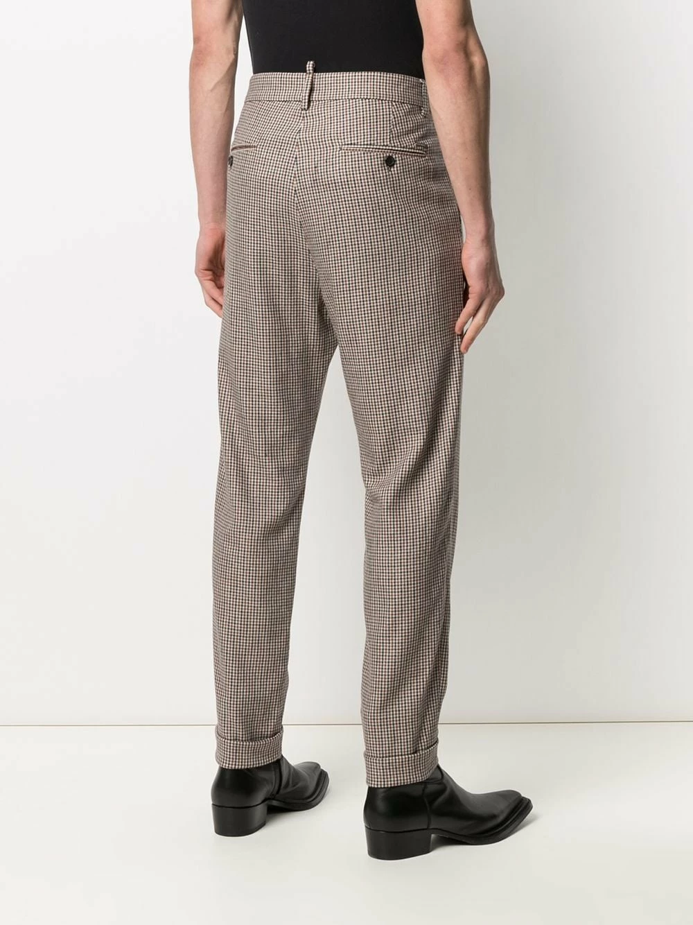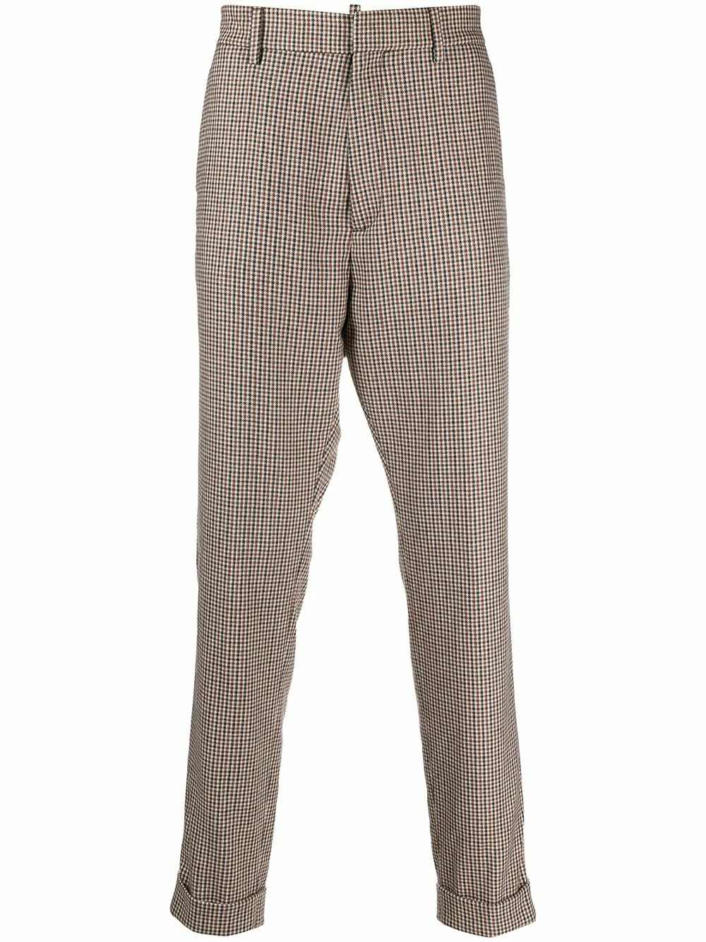 Taille haute, passants de ceinture, poches plaquées latérales, coupe droite, hauteur cheville, carreaux.