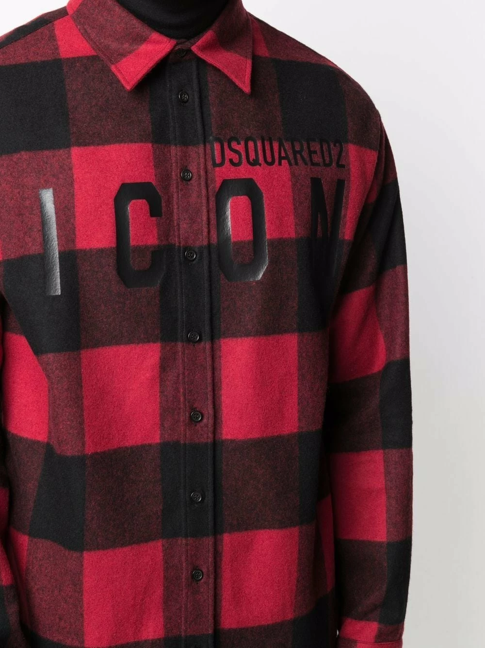 Carreaux Plaid, logo imprimé à la poitrine, manches longues, col classique. Couleur : rouge.