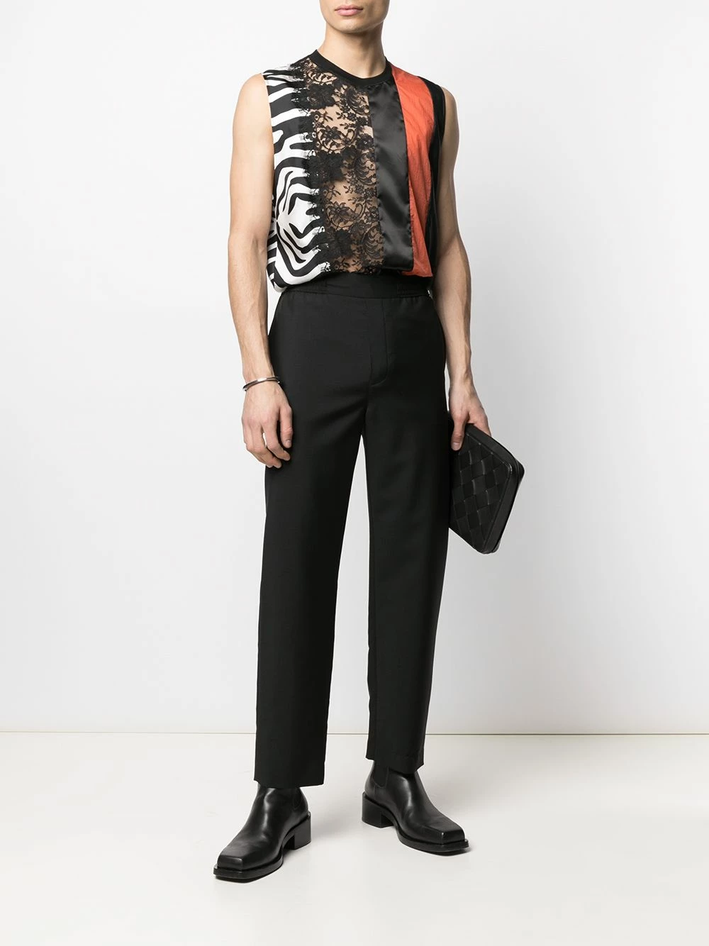 Fini satiné, design à empiècements colour block, imprimé zèbre, empiècements en dentelle, encolure ronde, design sans manches.