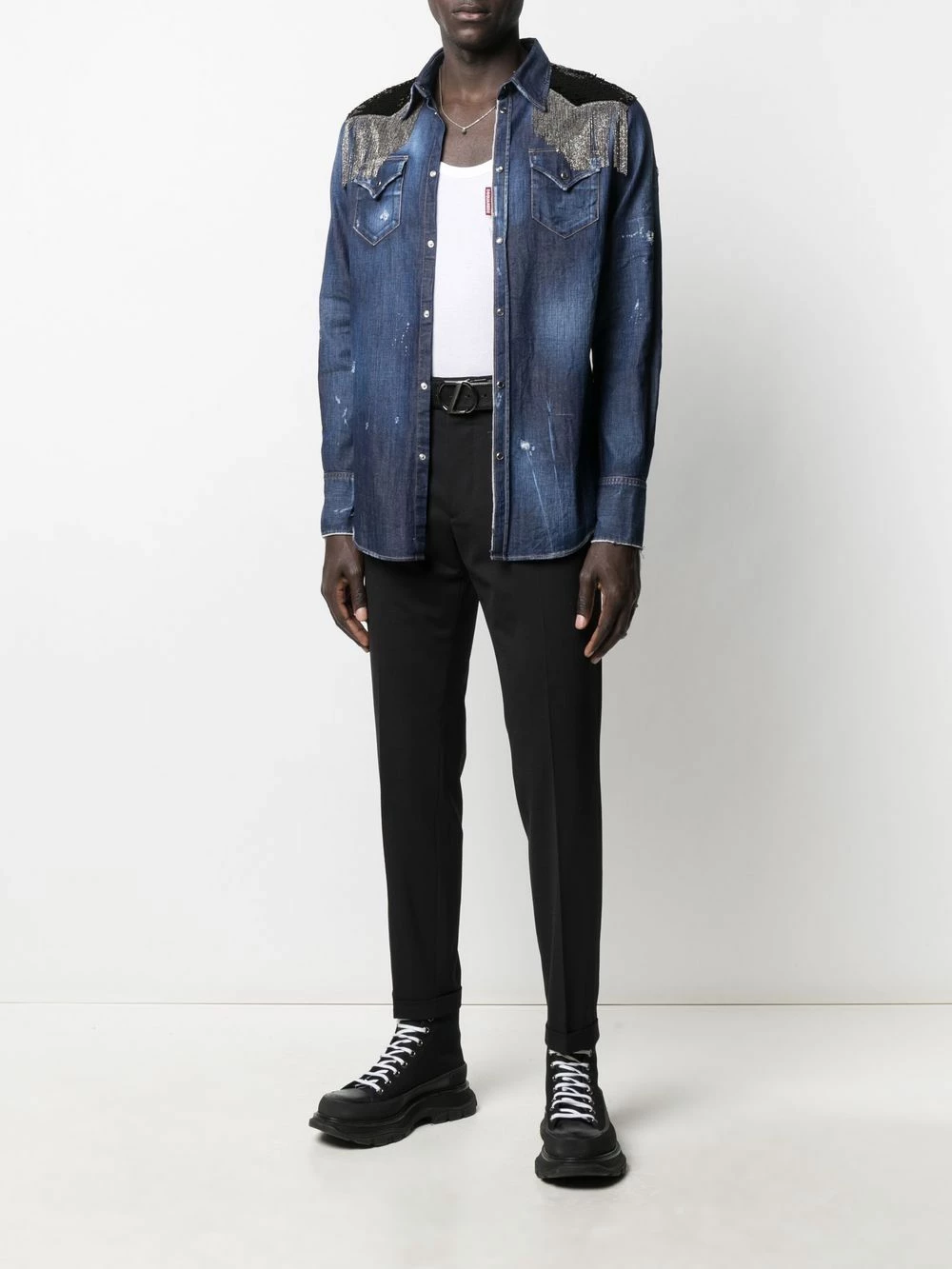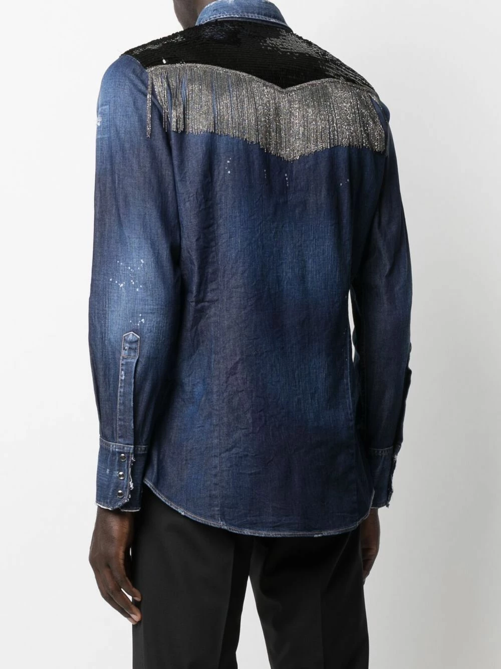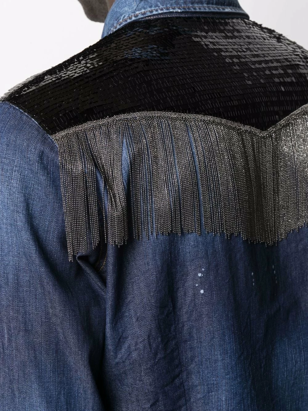 Effet usé, design à empiècements, finition à franges, ornements en sequins, fermeture à bouton pression, poignets à boutons pression. Couleur : bleu. Matière : coton mélangé.