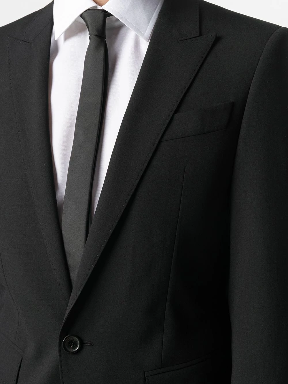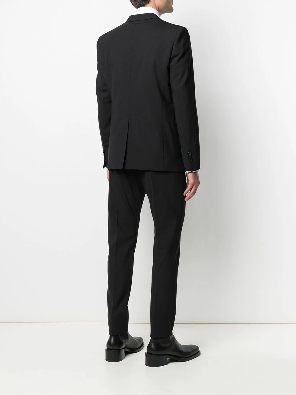Revers pointus, boutonnière sur le devant, manches longues, poches devant à rabat, fente arrière, passants de ceinture, deux poches arrières boutonnées. Couleur : noir.