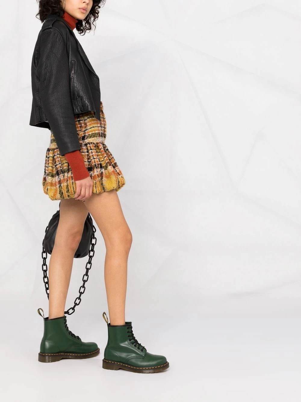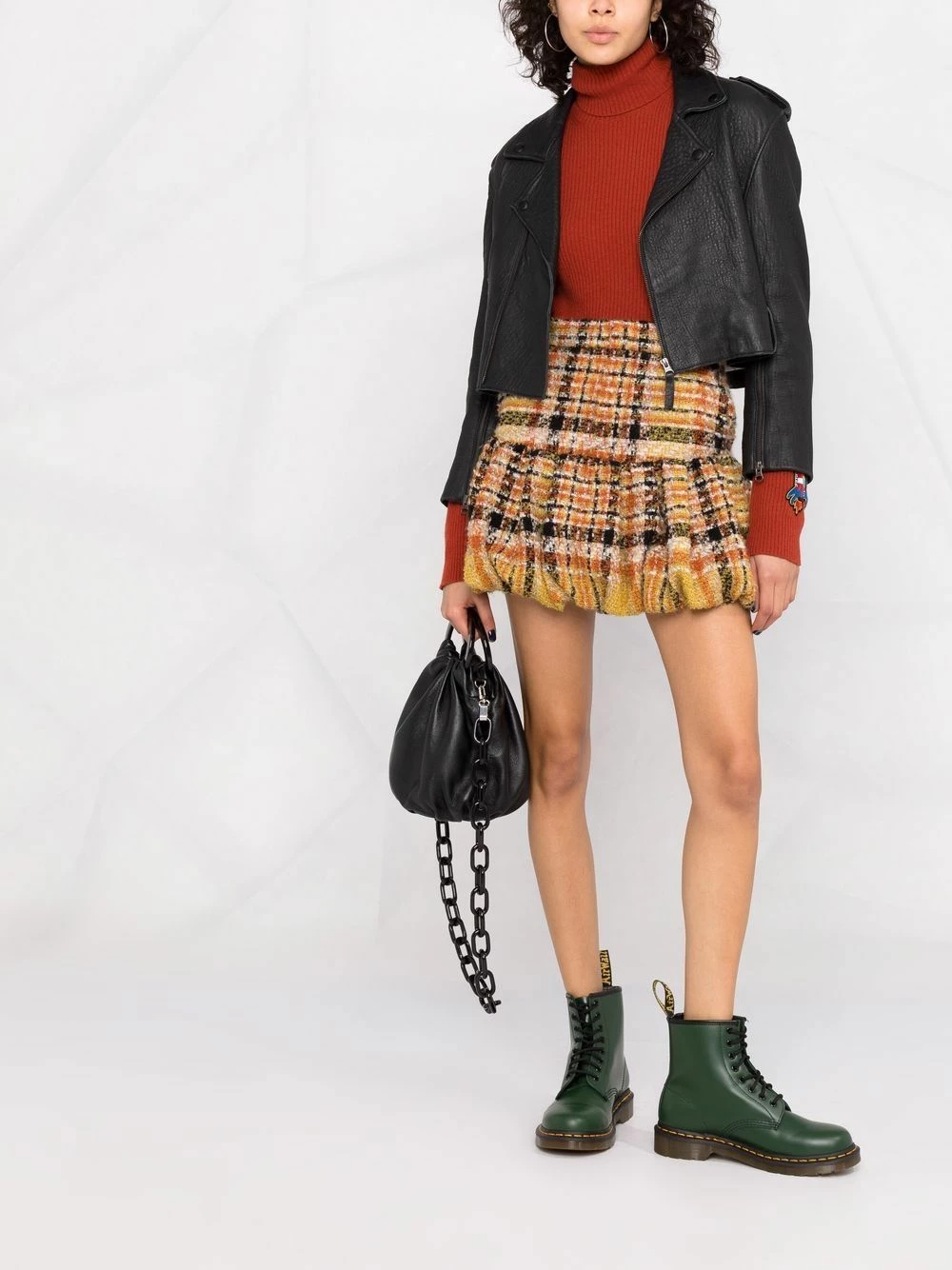 Carreaux, design tricoté, taille haute, fermeture dissimulée sur le côté, poches latérales fendues, ourlet bouffant, coupe courte.