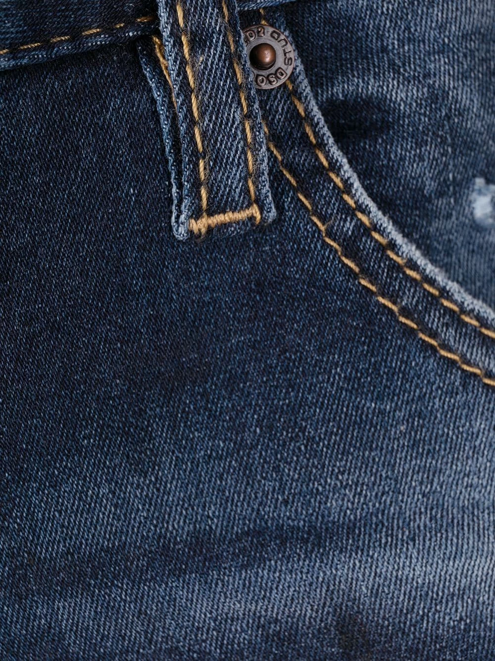 Effet usé, effet taches de peinture, boutonnière sur le devant, passants de ceinture, 5 poches classiques, longueur crop, coupe skinny. Couleur : Bleu.
