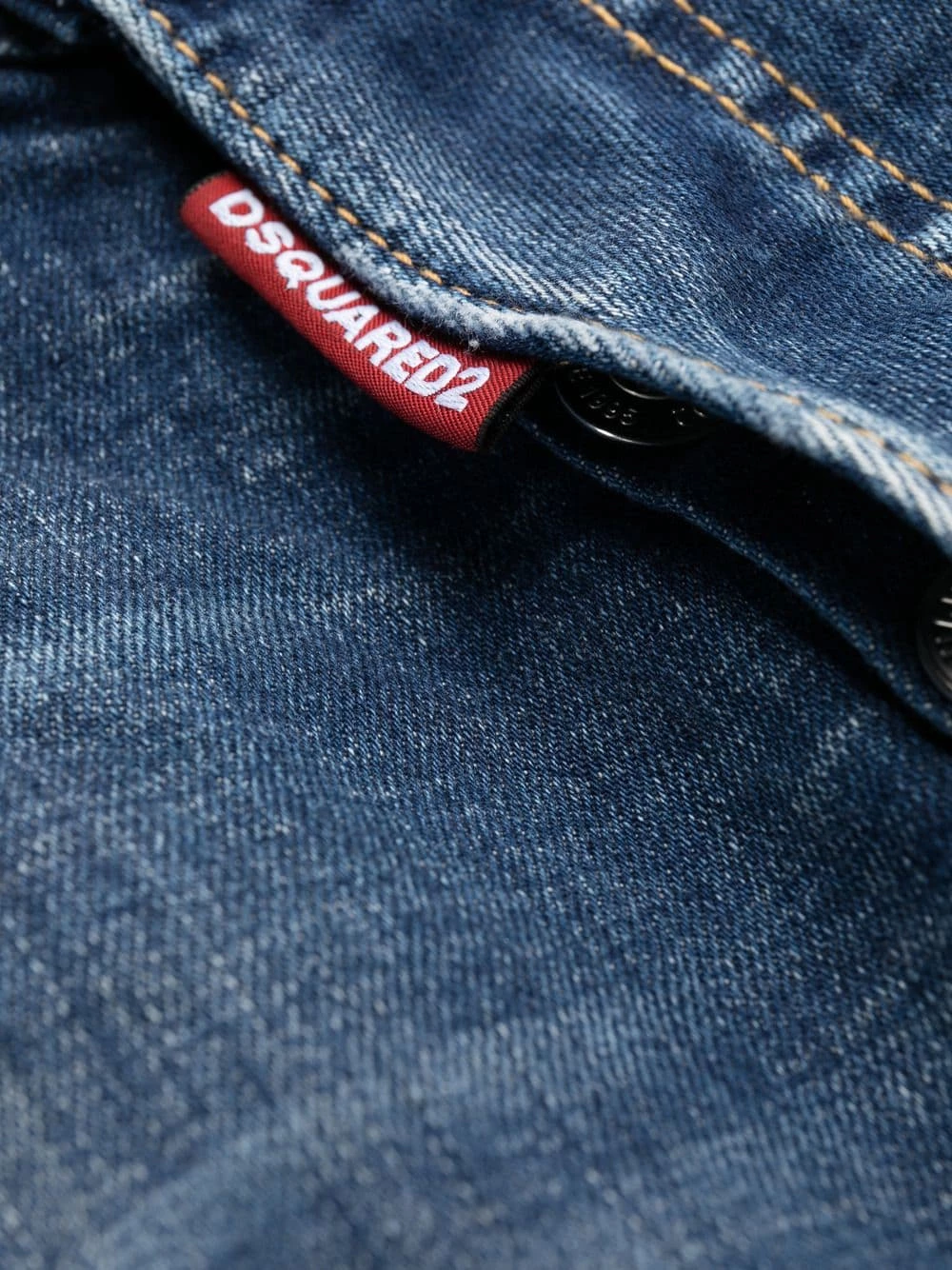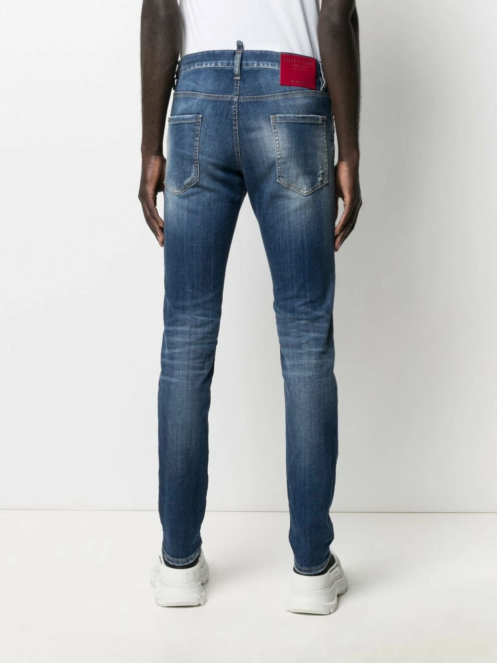 Effet usé, effet délavé, 5 poches classiques, patch logo embossé sur l’arrière, boutonnière sur le devant, passants de ceinture. Couleur : bleu.