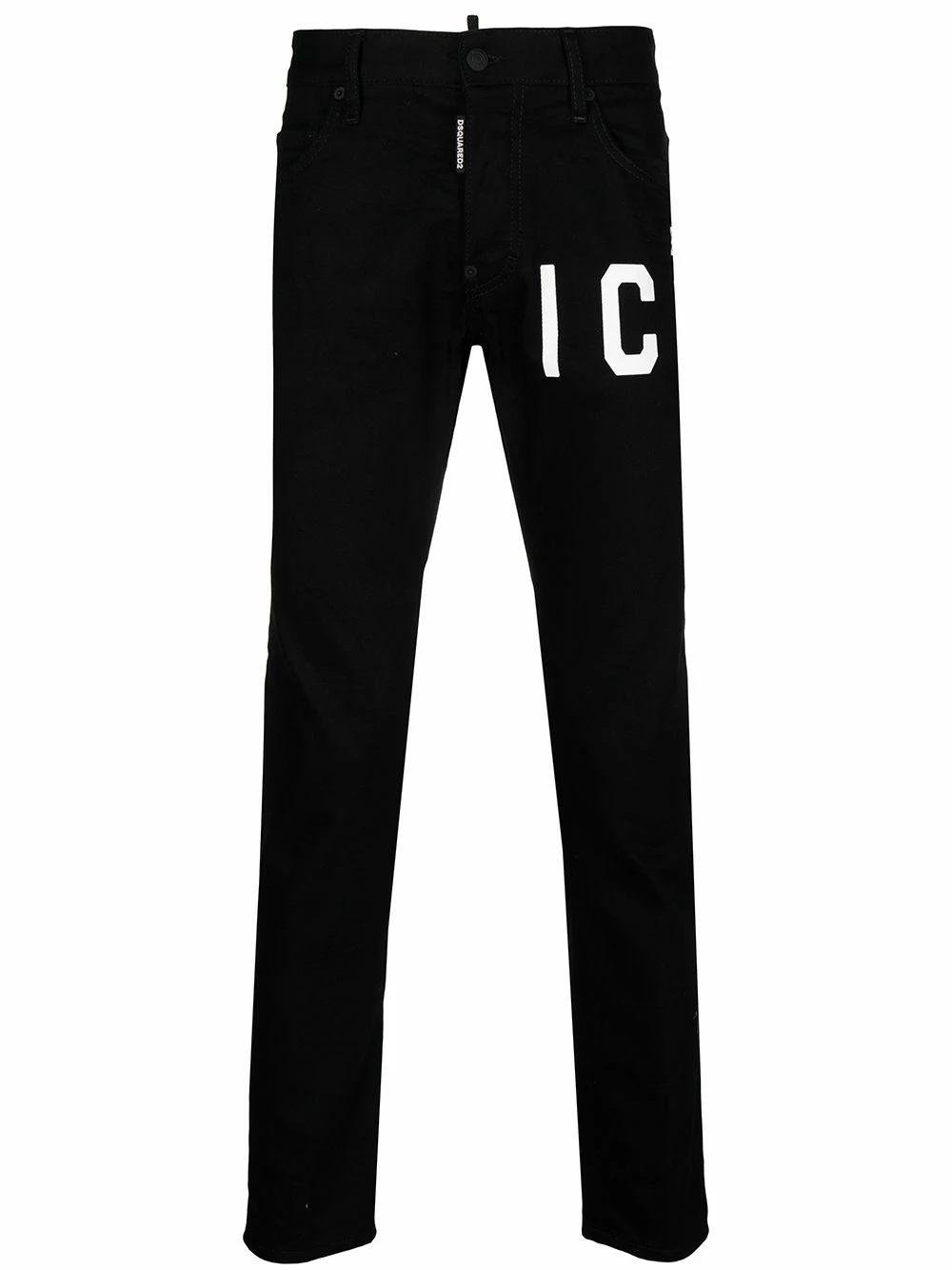 Taille basse, passants de ceinture, boutonnière sur le devant, 5 poches classiques, coupe ajustée. Couleur : noir.
