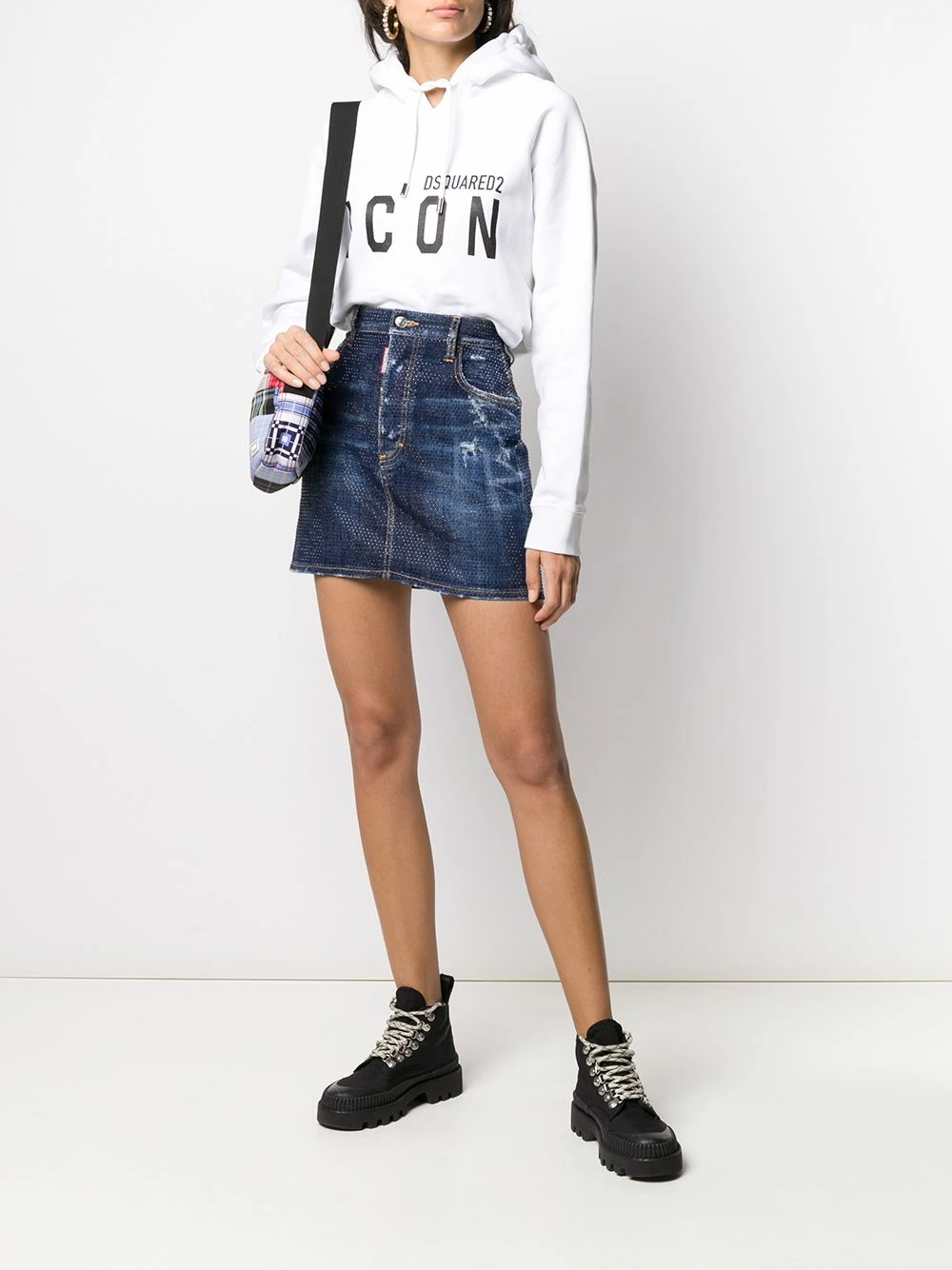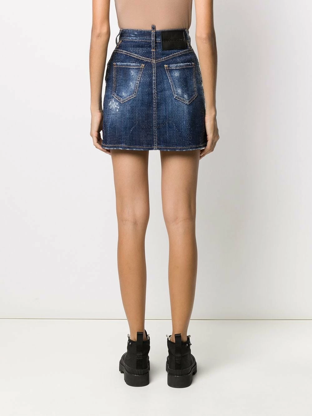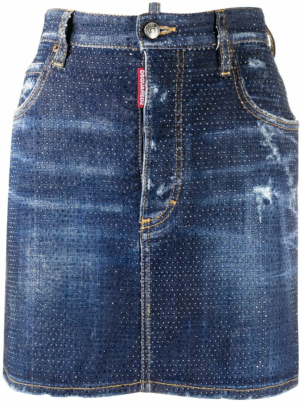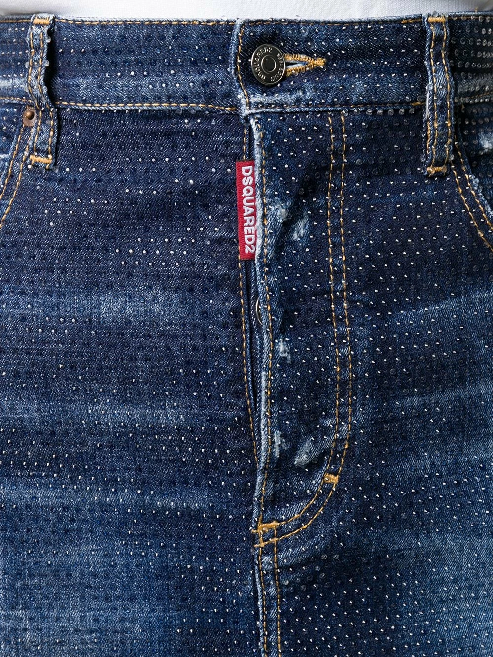 Jupe en jean à ornements Dsquared2 avec effet délavé, taille haute, passants de ceinture à la taille, boutonnière sur le devant, étiquette logo, coupe classique cinq poches, patch à logo à l’arrière, ornements en cristal, effet usé et coupe courte.