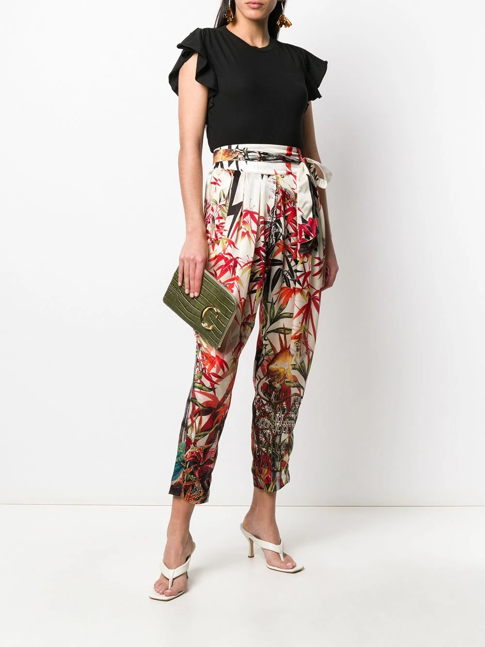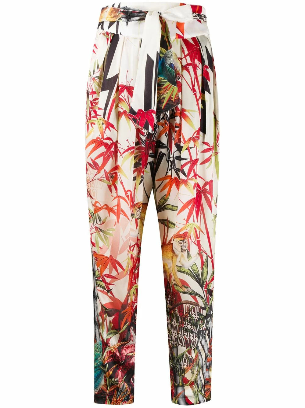 Taille haute, fermeture à nouer sur le devant, passants de ceinture, détails de plis, coupe fuselée, longueur crop. Matière : soie.