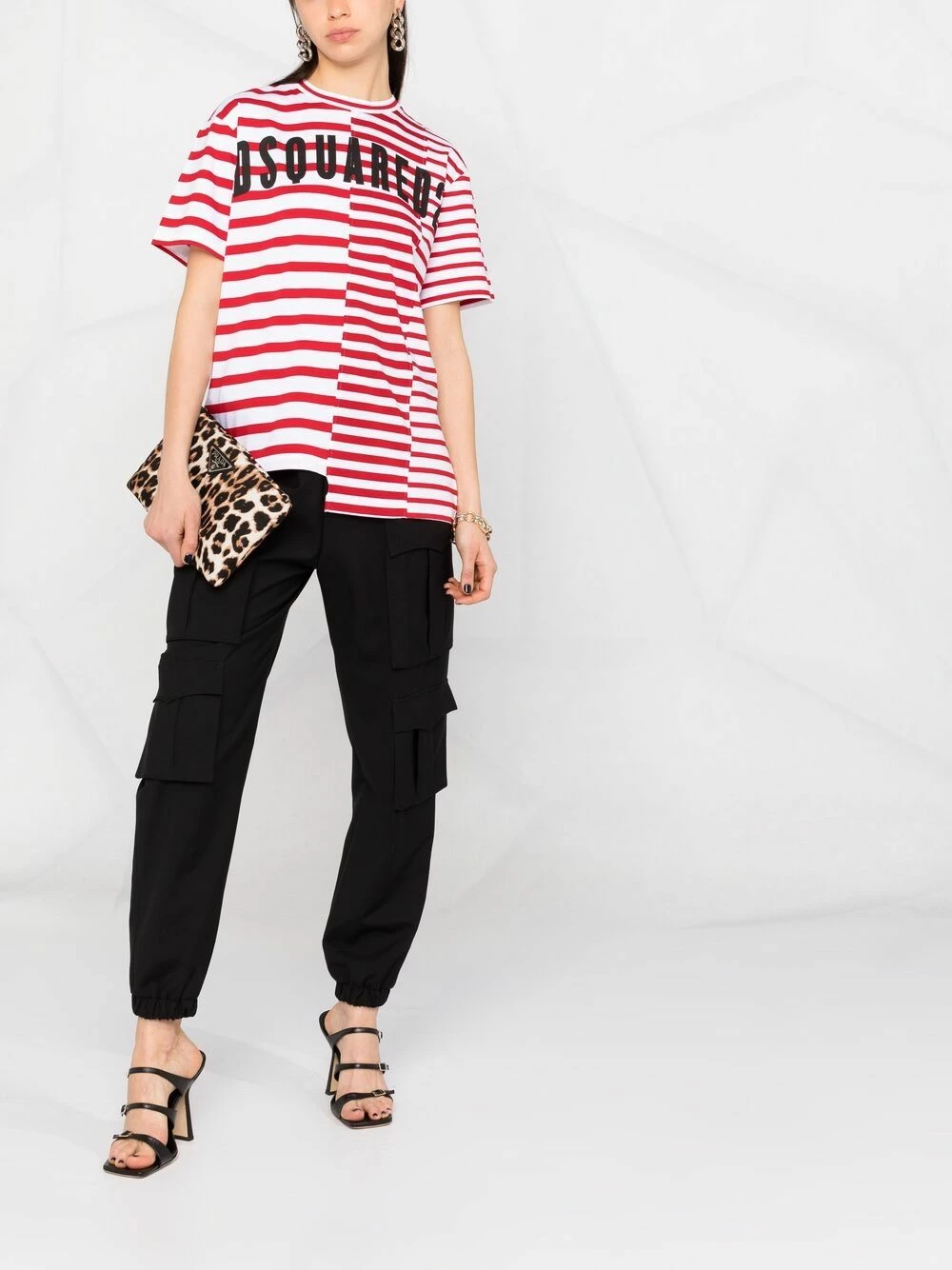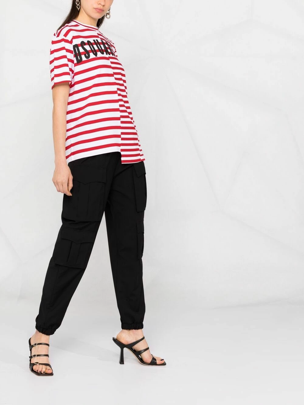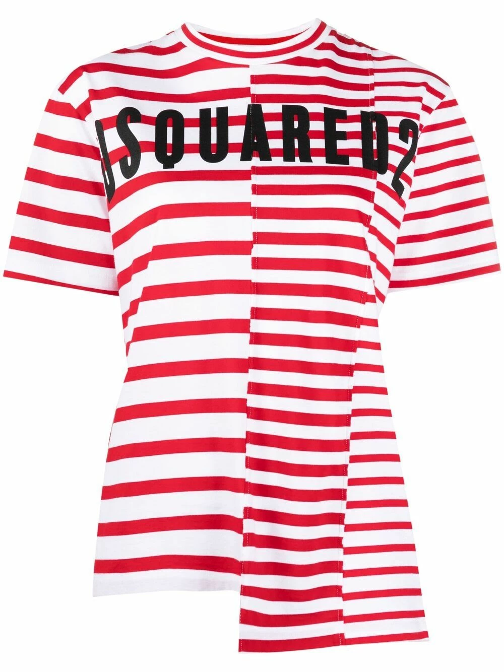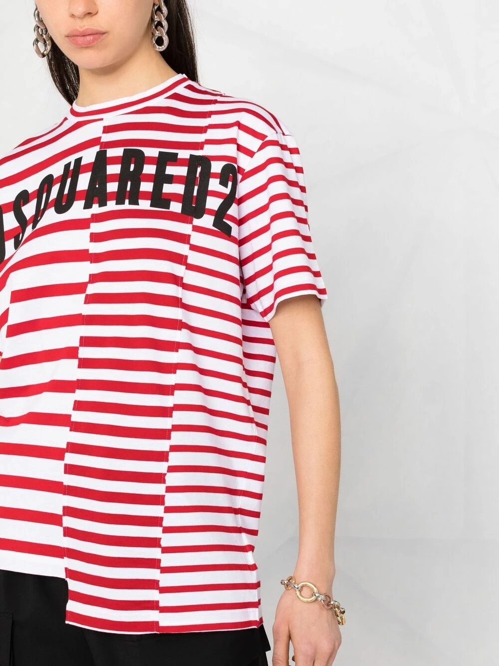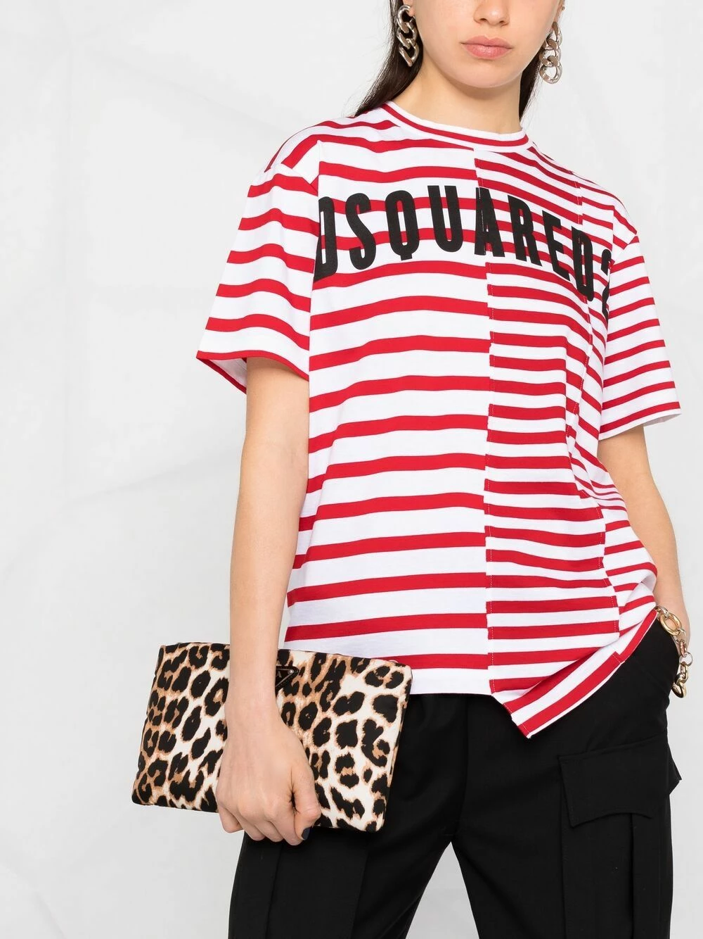 Rayures vives, logo imprimé à la poitrine, encolure ras du cou, manches courtes, ourlet asymétrique. Matière : coton.