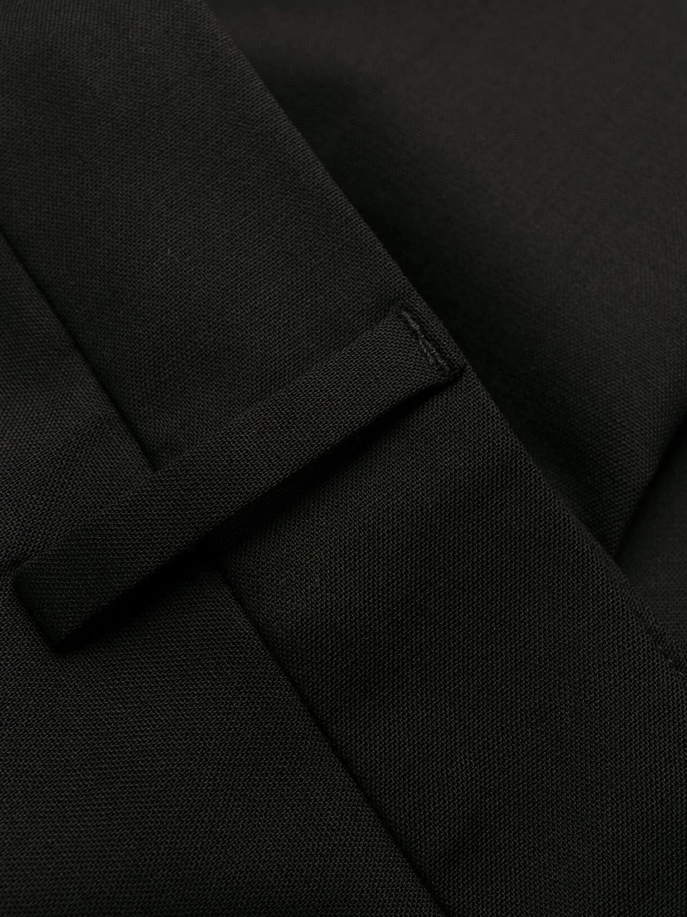 Plaque logo argentée, passants de ceinture, taille normale, fermeture à agrafes sur le devant, coupe ajustée, longueur crop, deux poches latérales passepoilées, poches arrière passepoilées. Couleur : noir.