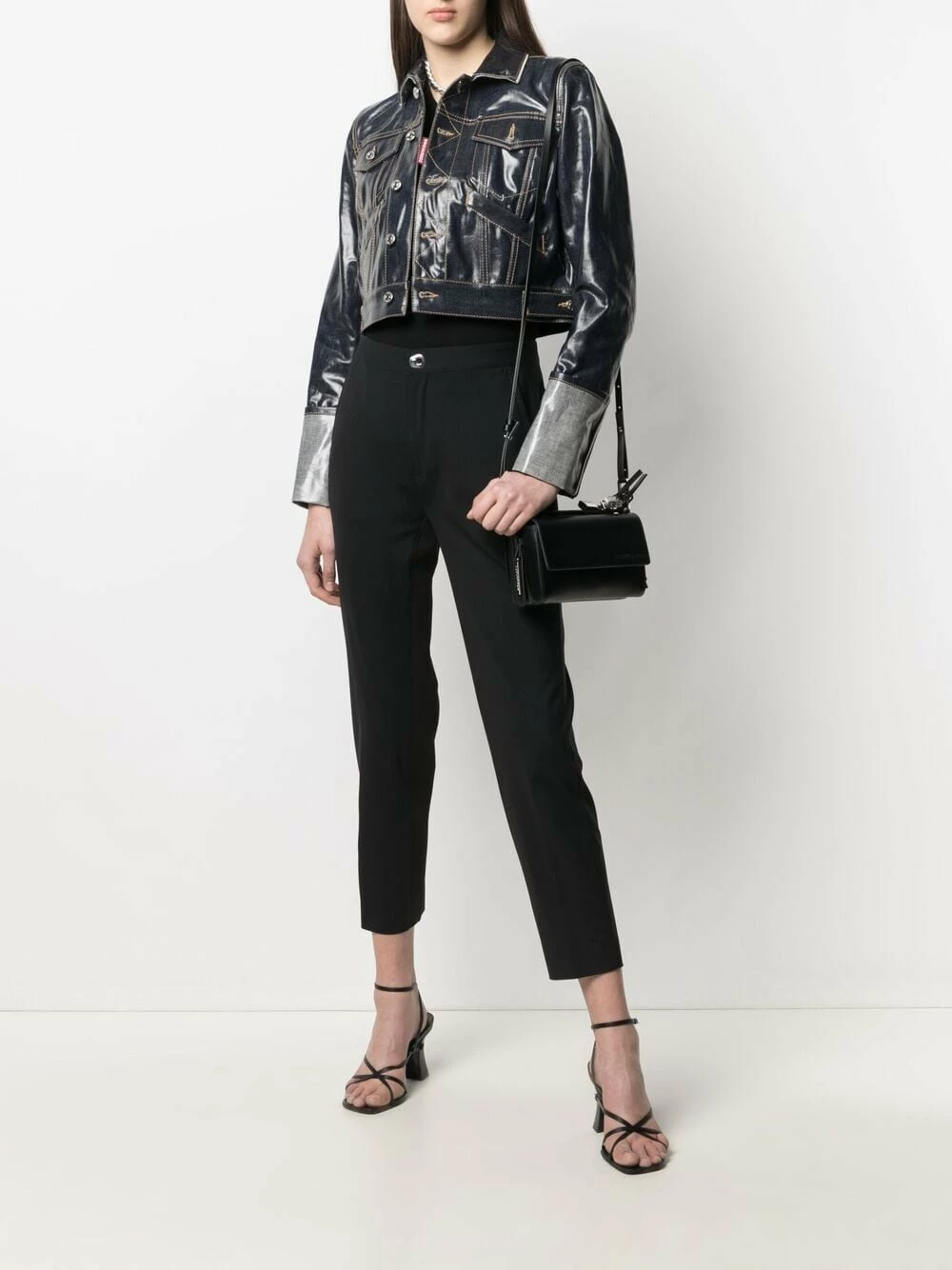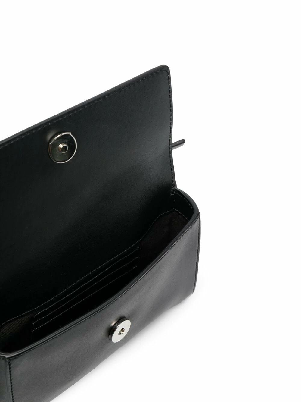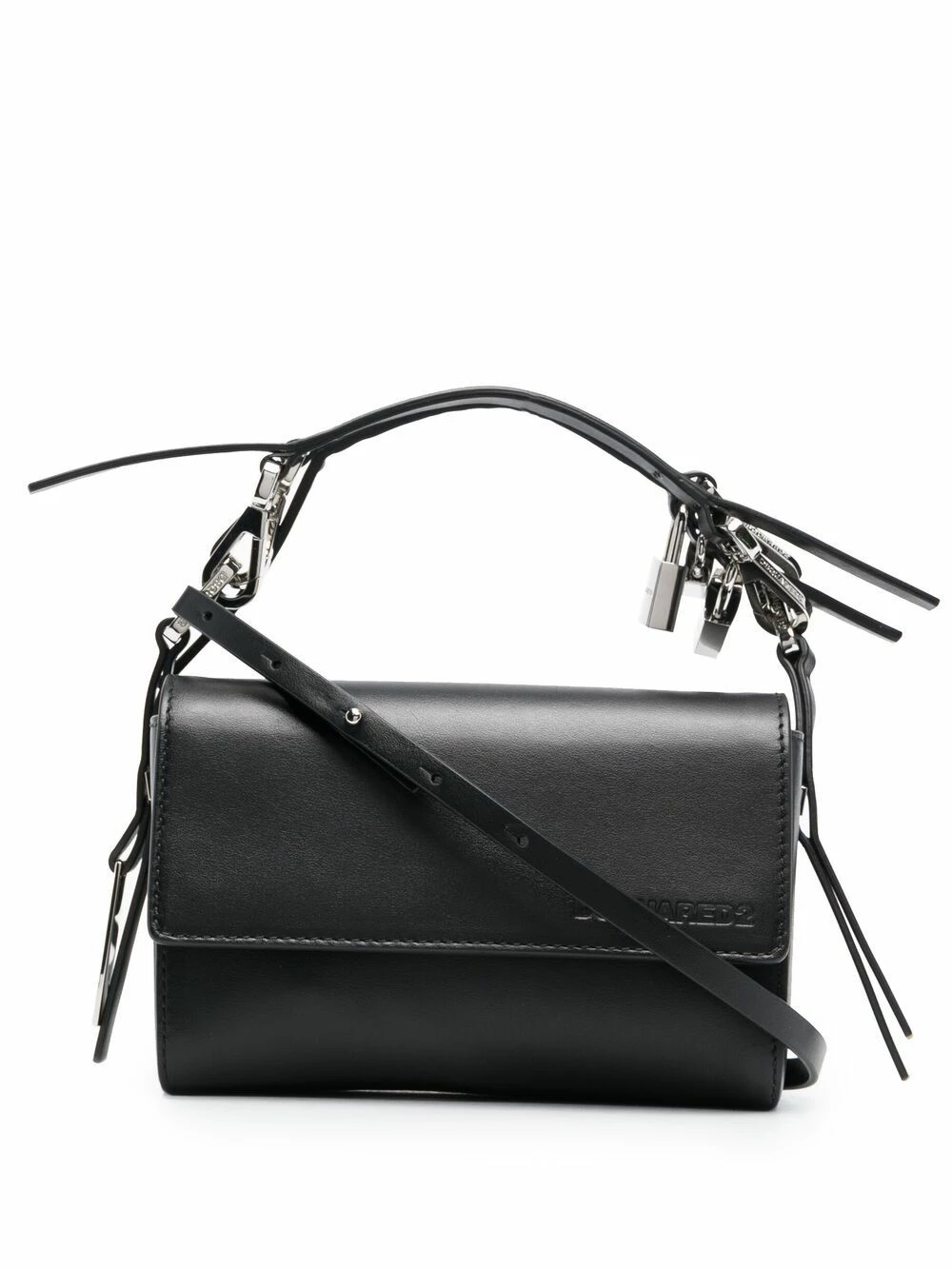 Détail de cadenas, ornements argentés, anse arrondie, bride porté épaule détachable, rabat sur le dessus à fermeture magnétique. Couleur : noir. Matière : cuir.