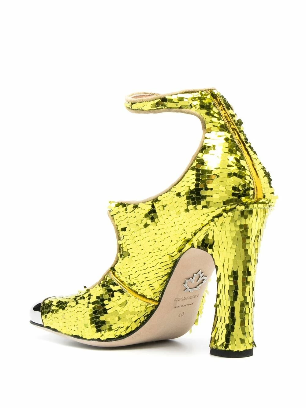 Ornements en sequins, bout carré, bout contrastant, logo gravé, semelle intérieure à logo, boutonnière sur le côté, talon haut. Couleur : jaune. Matière : cuir.