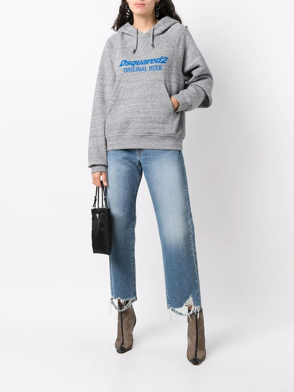 Logo imprimé sur le devant, poche plaquée sur le devant, capuche à lien de resserrage, manches longues, poignets élastiqués, ourlet élastiqué. Matière : coton.