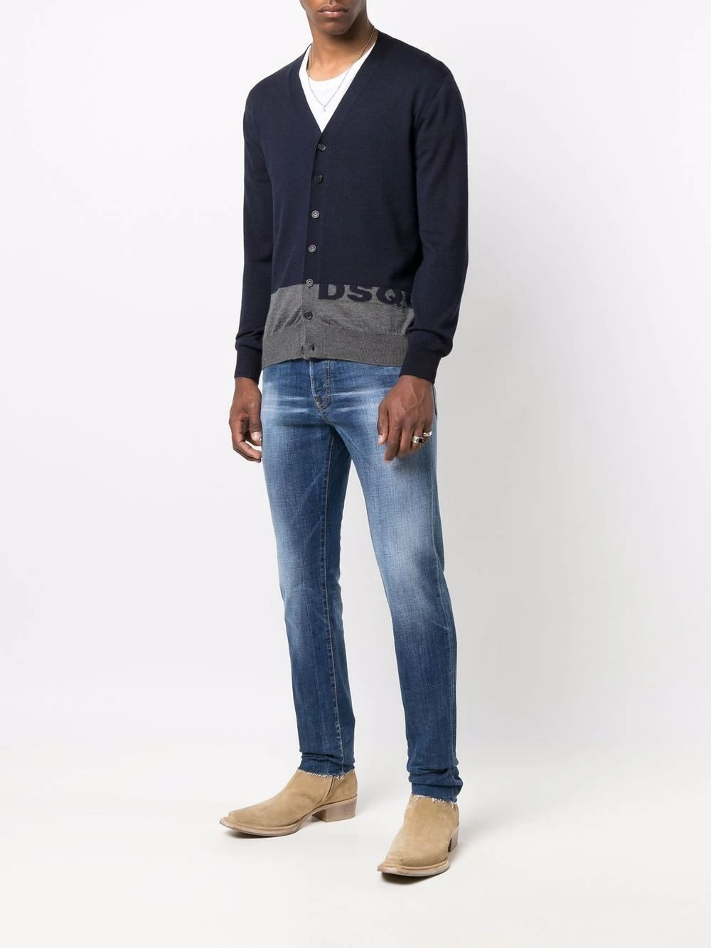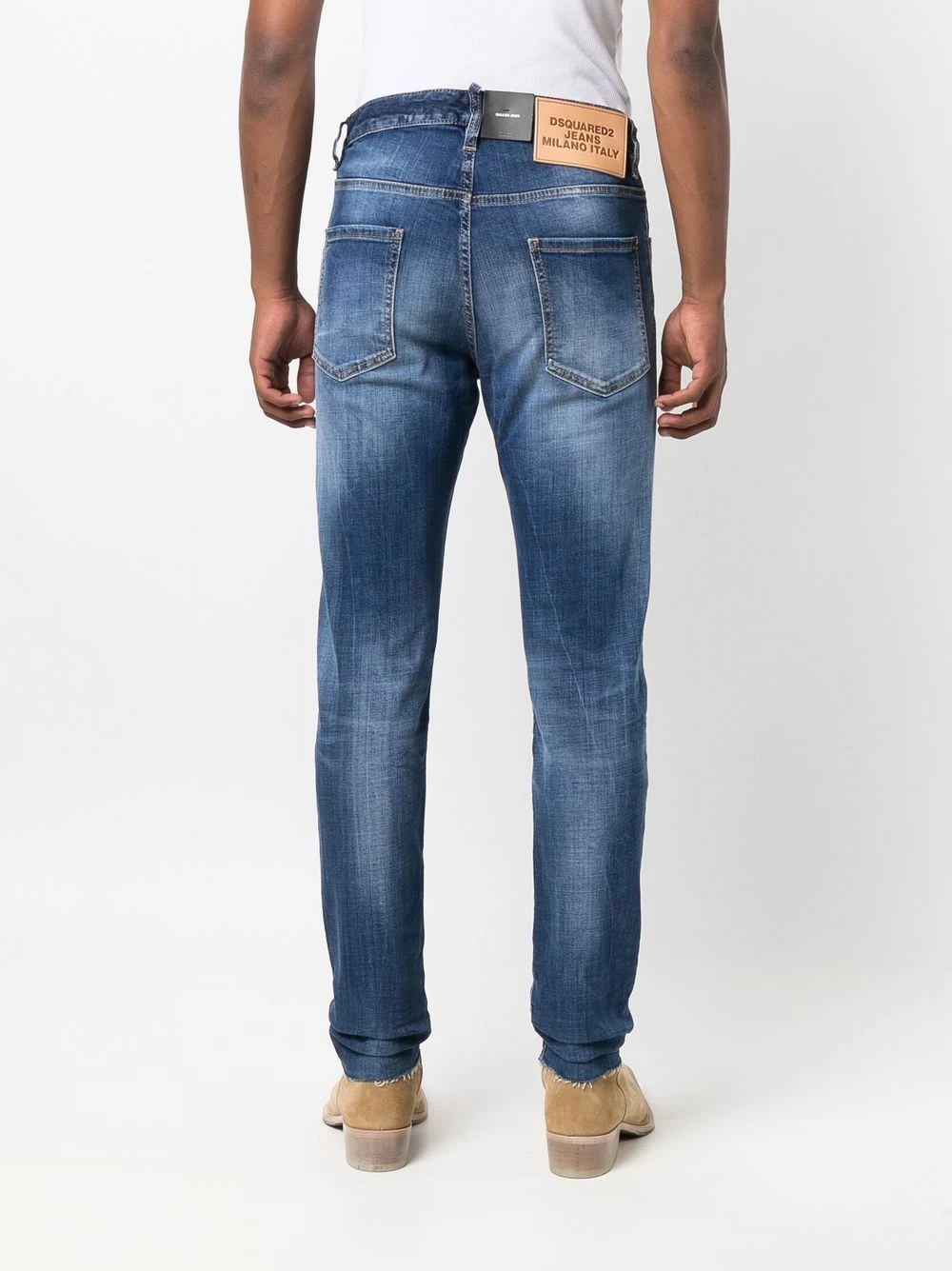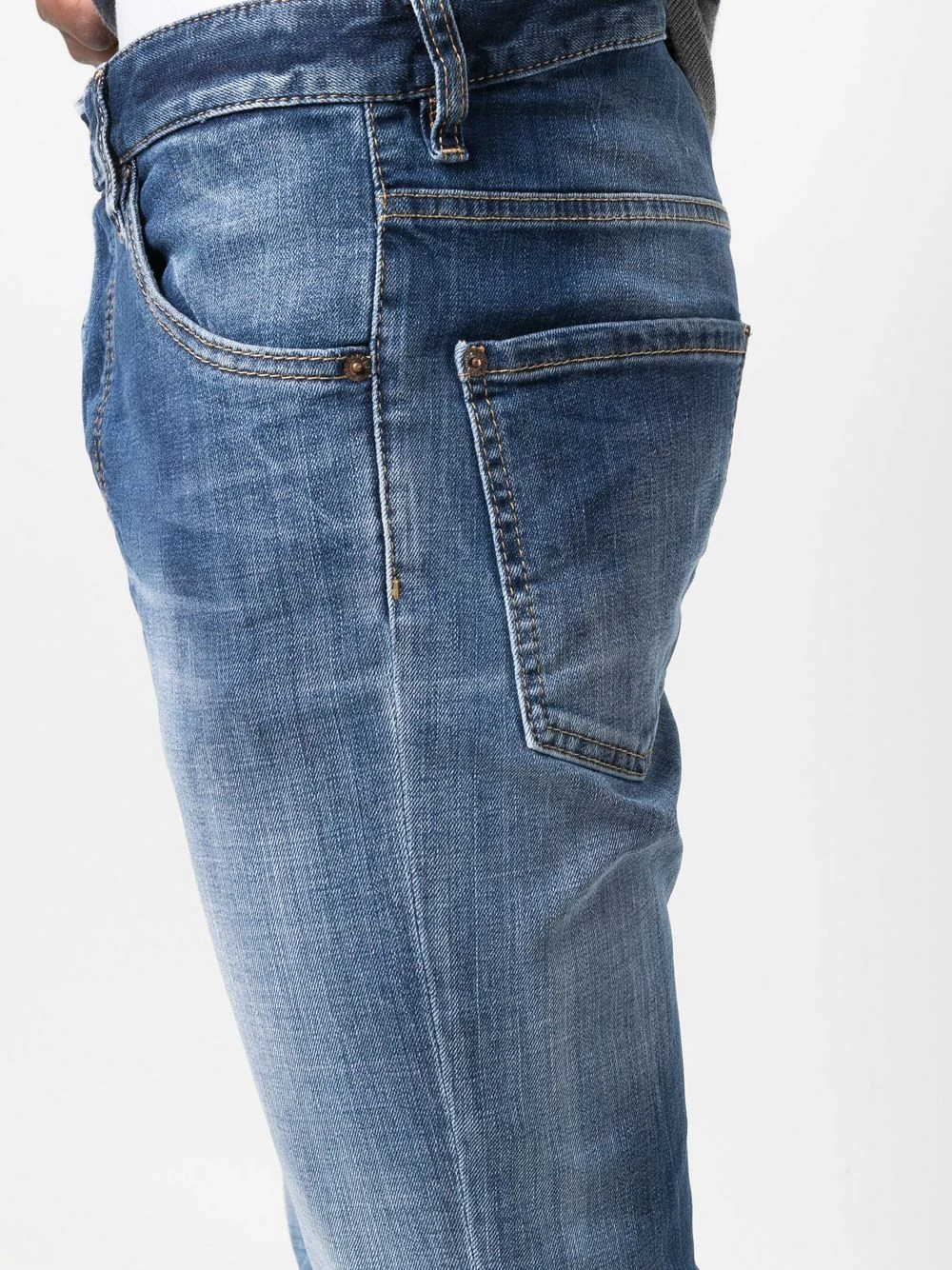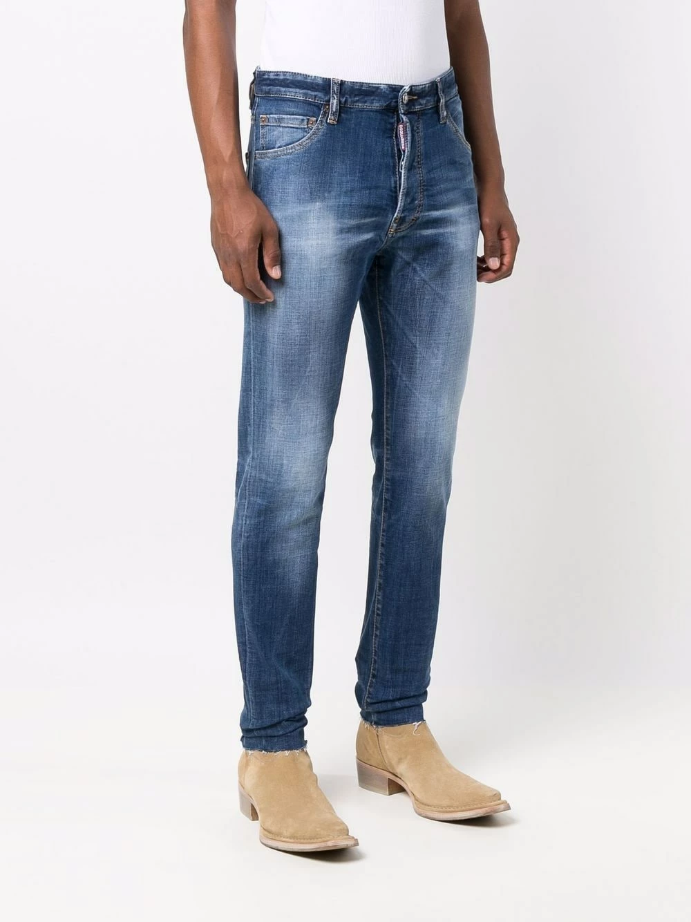 Effet semi-délavé, finitions à effet usé sur les cuisses, patch logo sur l’arrière, fermeture boutonnée, passants de ceinture, cinq poches classiques. Couleur : bleu.
