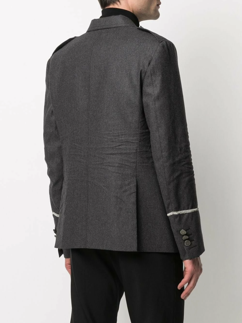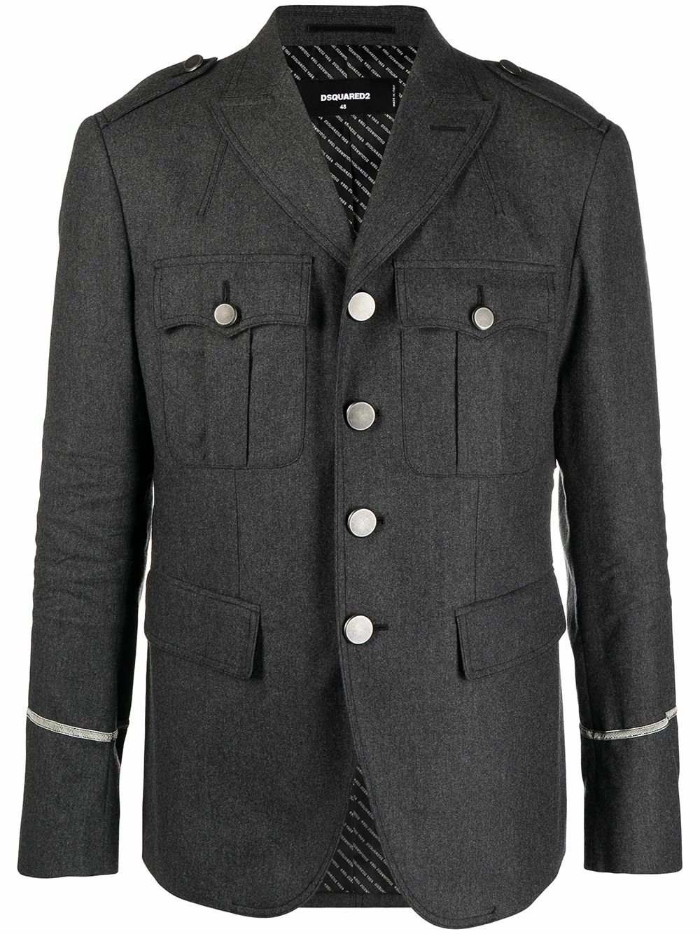 Doublure intégrale, épaulettes, revers crantés, fermeture boutonnée, poches devant à rabat. Couleur : Gris.