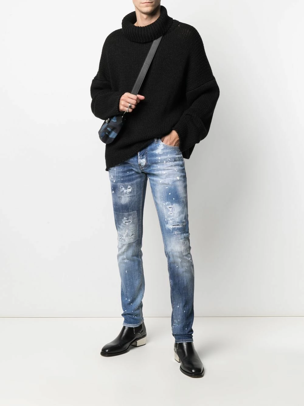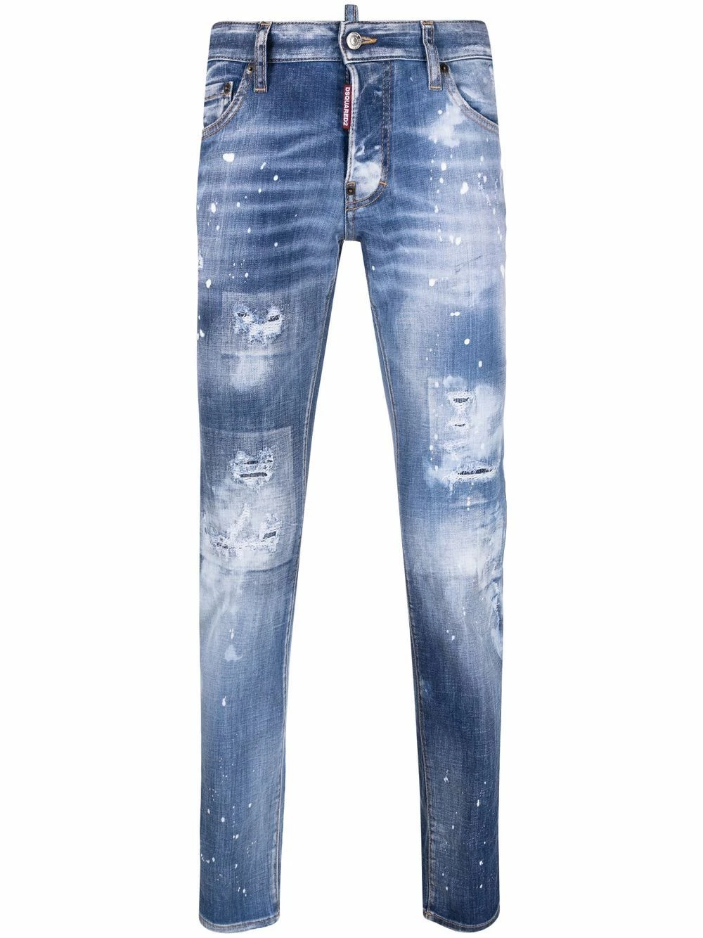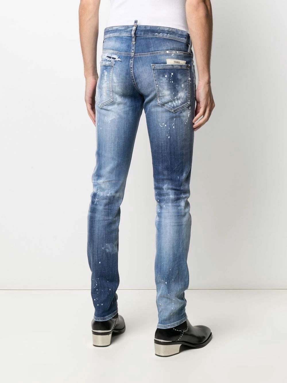Taille mi-haute, coutures contrastantes, fermeture boutonnée, cinq poches classiques, finitions à effet usé, effet délavé, effet taches de peinture, effet usé, finitions effilochées, patch logo sur l’arrière, coupe slim. Couleur : bleu.