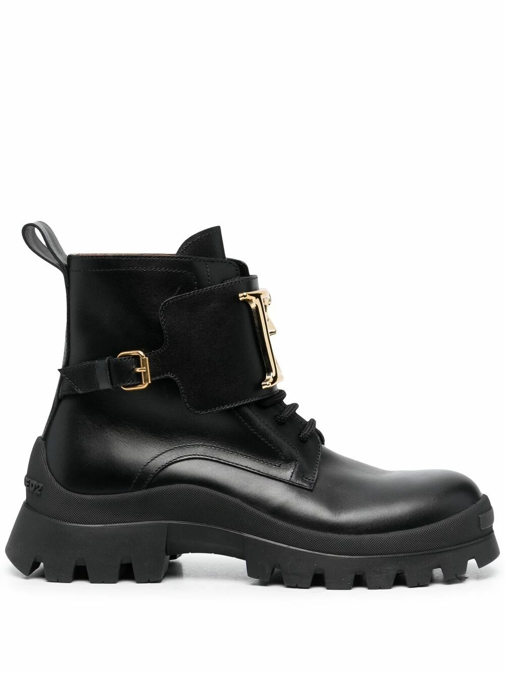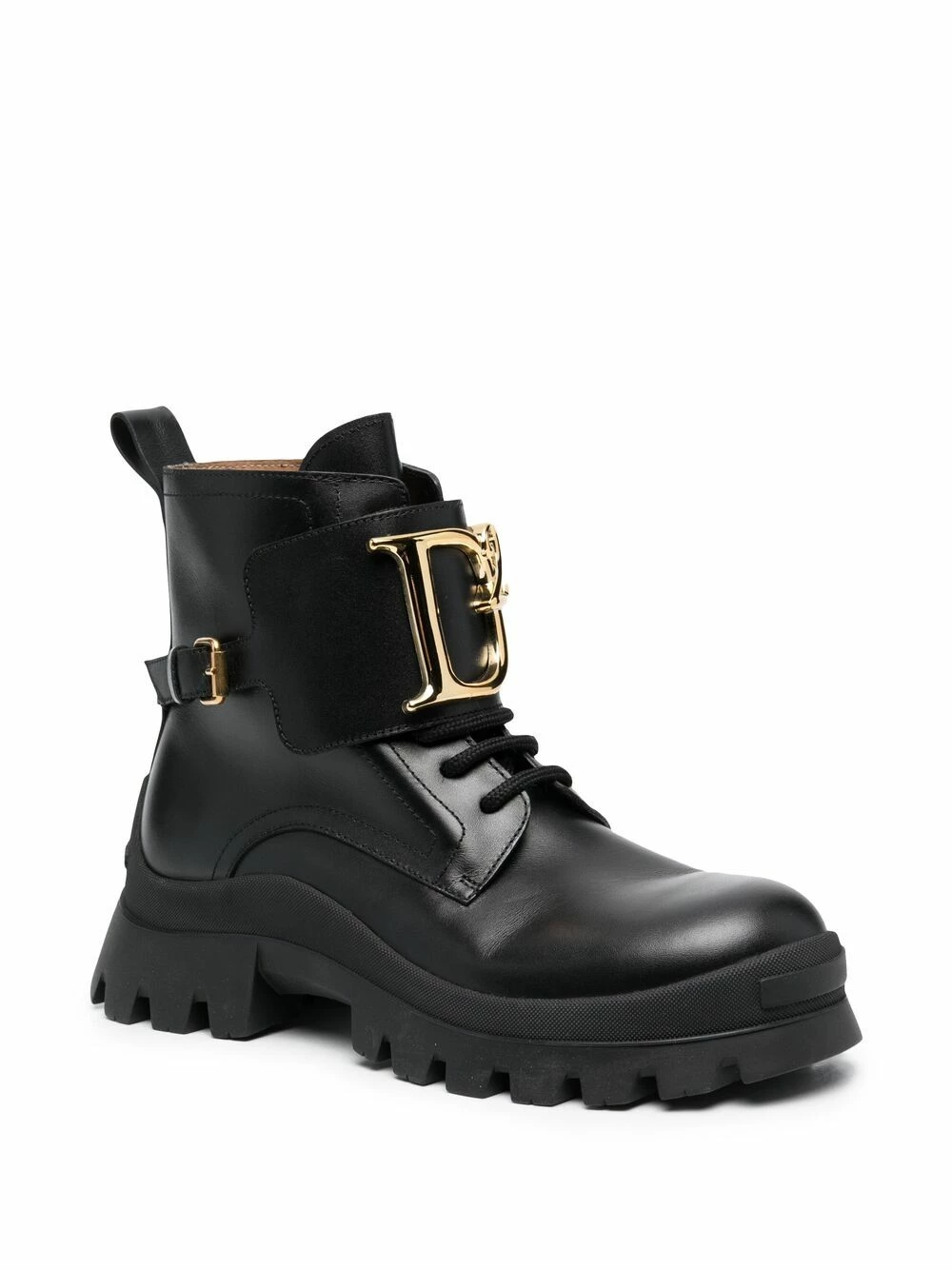 Plaque logo dorée, languette d’enfilage au talon, bout rond, semelle crantée en caoutchouc, semelle intérieure griffée. Couleur : noir. Matière : cuir.