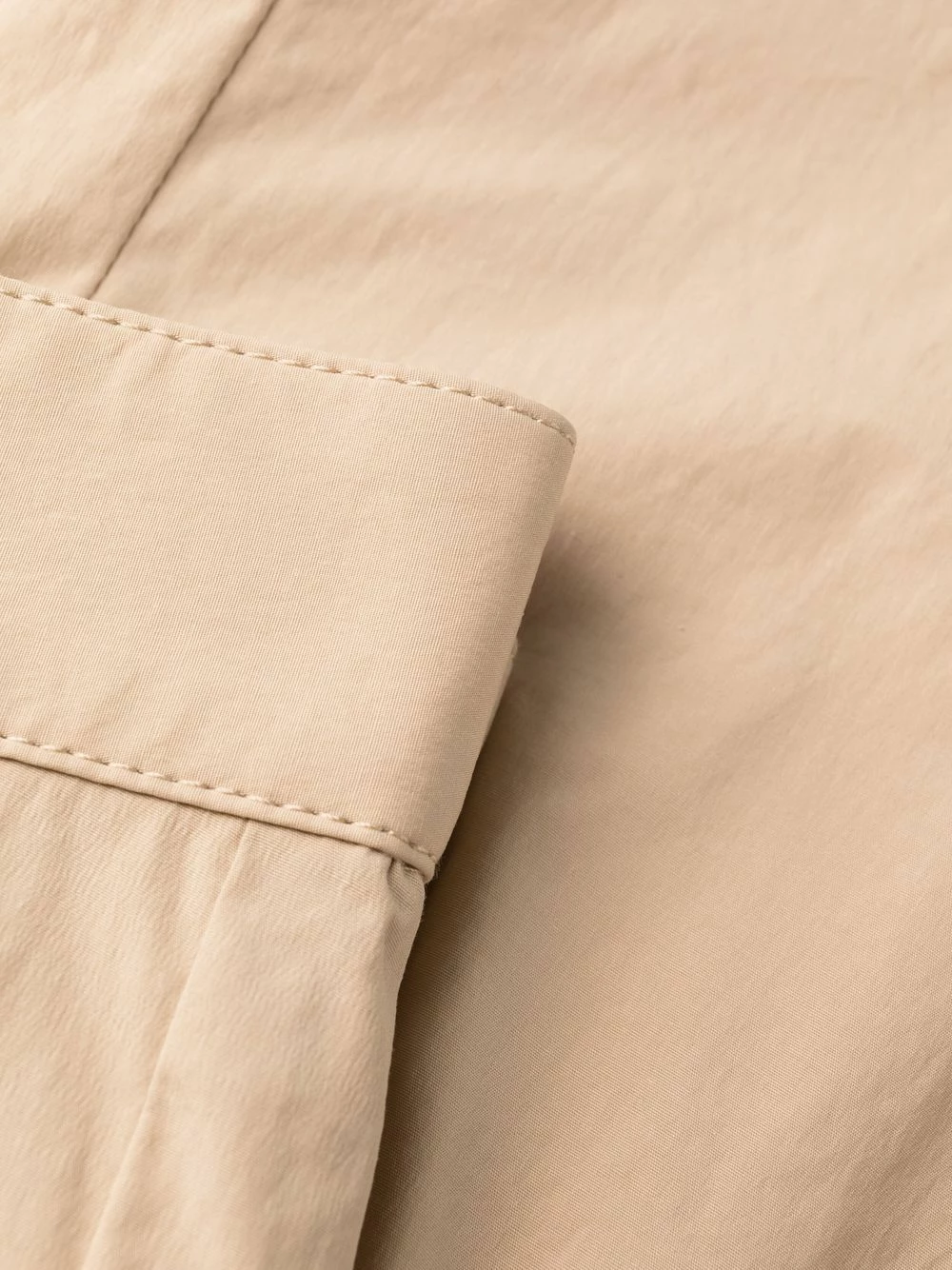 Logo imprimé sur le devant, taille mi-haute, passants de ceinture, fermeture à zip et boutons sur le devant, deux poches latérales à rabat, poches arrière passepoilées, coupe fuselée. Matière : coton.