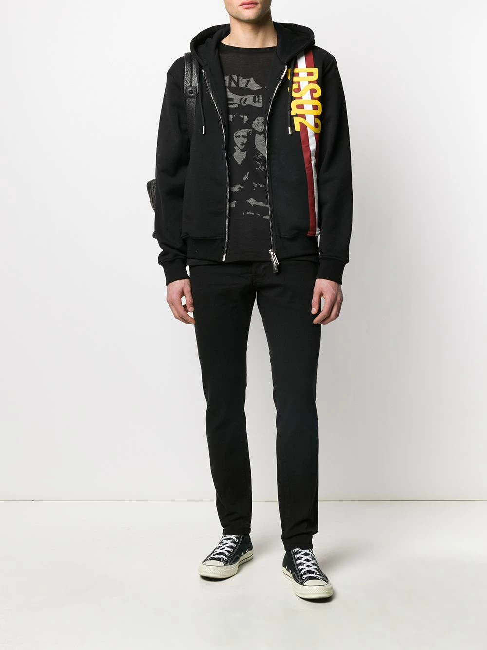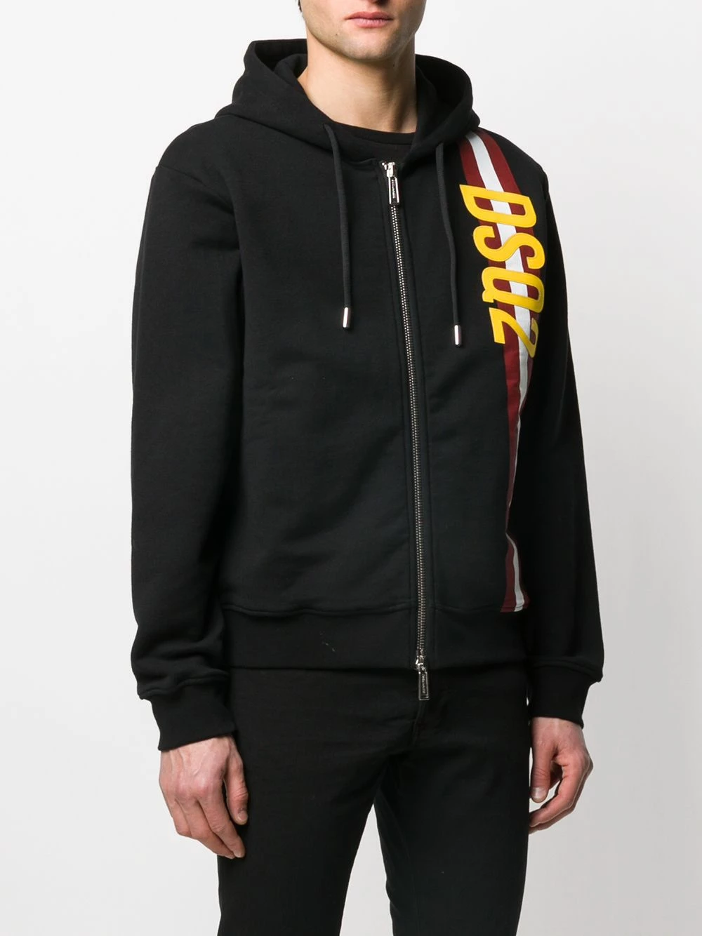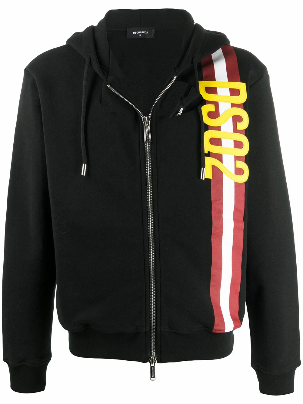 Sweat à capuche à logo brodé en coton Dsquared2 avec capuche à lien de resserrage, manches longues, effet d’épaules descendues, poignets resserrés, détail rayé sur le côté, appliques et fermeture zippée à double sens. Couleur : noir.