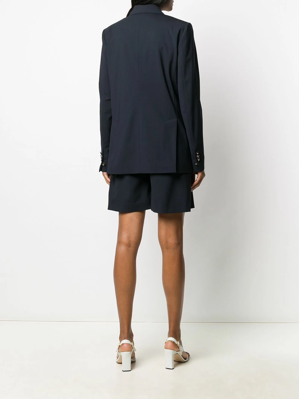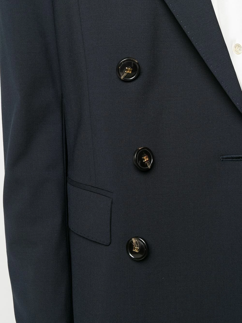 Revers crantés, boutonnière croisée, manches longues, poche passepoilée sur la poitrine, deux poches plaquées avant, double fente arrière, taille haute, passants de ceinture, détails de plis, deux poches latérales passepoilées, longueur genou.