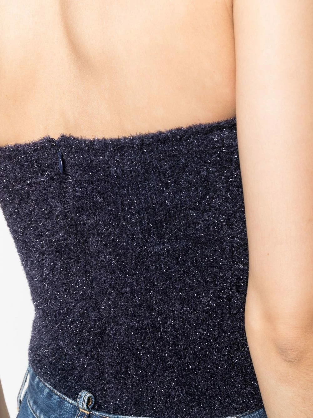 Tissage métallisé, encolure cœur, fermeture zippée à l’arrière, sans bretelles.
