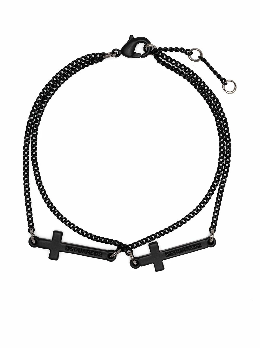 Fermoir mousqueton, chaîne à longueur ajustable, breloque croix, maille gourmette. Couleur : noir. Matière : laiton.
